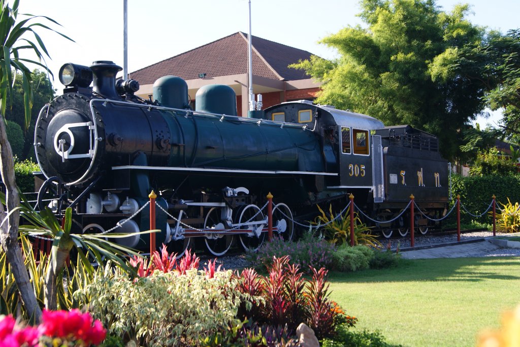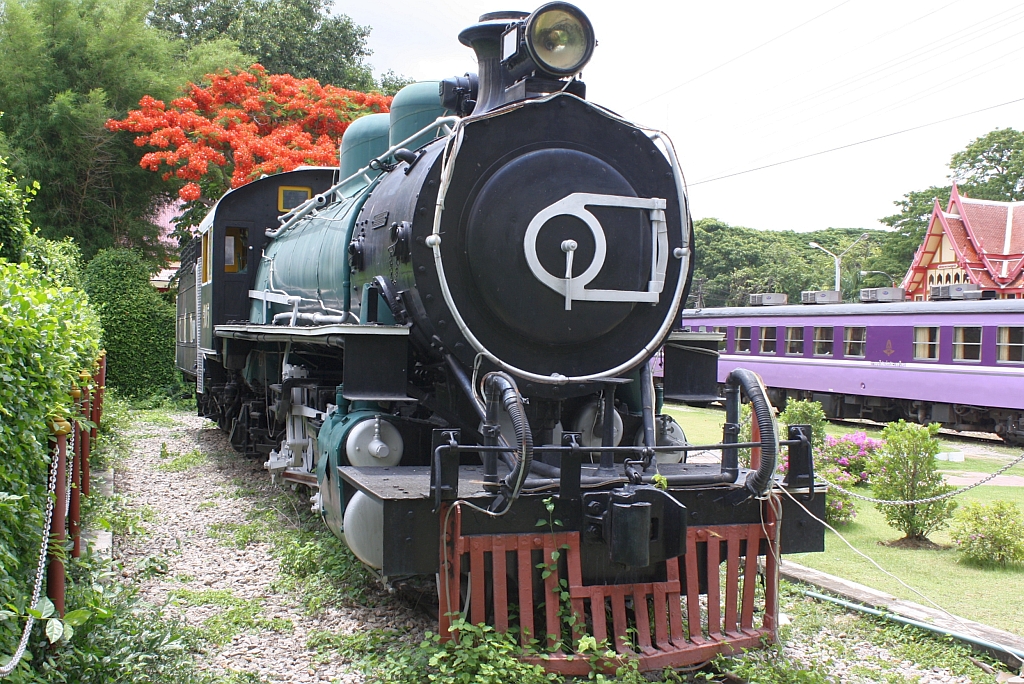 305 (1'D1'-h3, Baldwin - USA, Bauj. 1925) steht gegenüber des Aufnahmsgebäude des Bf. Hua Hin als Denkmal. Bild vom 03.Juni 2012.