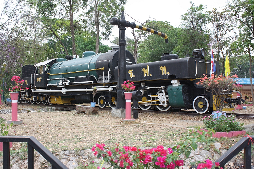 Garratt 457 (1'D1'-h2 + 1'D1'-h2, Henschel, Bauj. 1936, Fab.Nr. 23109) am 11.März 2012 im Park vor dem Bf. Kanchanaburi. Von den 8 Garratts (451-456 Bauj.1926, 457-458 Bauj.1936) der thailändischen Staatsbahn ist die 457 die einzig Erhaltene.