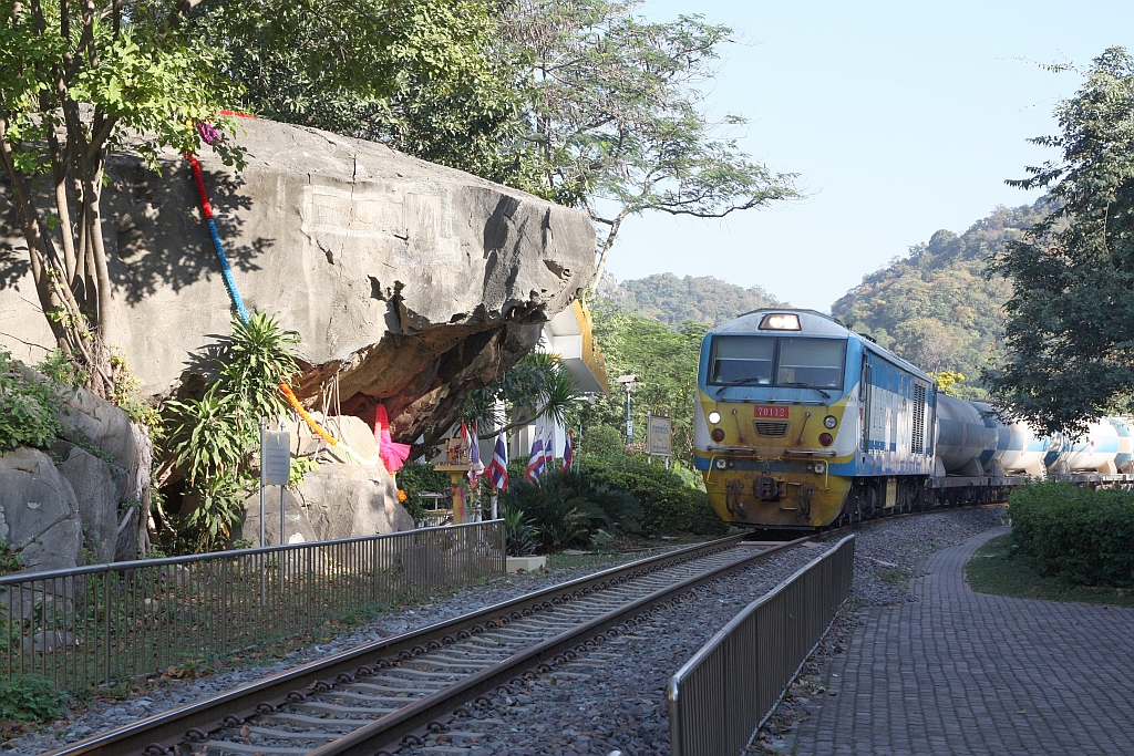TPIPL Nr.3 (33-003, CK5 004) am 03.Dezember 2025 beim Verschub im TPI Polene Mittaphap Cement Plant. - Im Bild rechts die öffentliche Straße vom Highway 2 nach Hin Lap welche auf 230 Meter Länge einspurig auf einem Gleis der Anschlussbahn durchs Werk führt.