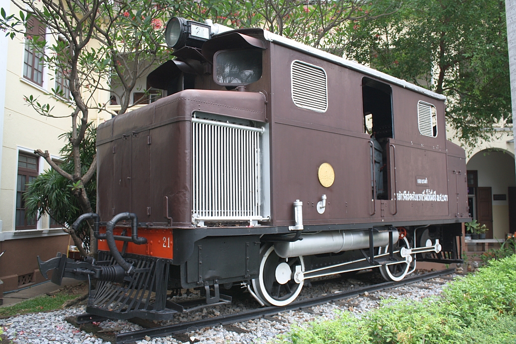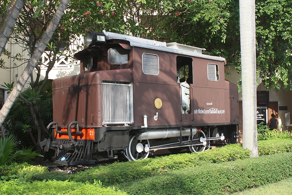Links vom Haupteingang zum SRT-Head Quarter steht mit der "21" die erste Diesellok Thailands. Diese Lok wurde mit ihrer Schwester "22" von SLM 1928 gebaut, war 23,5t schwer, hatte einen 6 Zyl.-Reihenmotor mit 200PS bei 500U/min, Antrieb mittels Blindwelle und Stangen auf beide Achsen, und war 40Km/h schnell; Bild vom 16.März 2011.