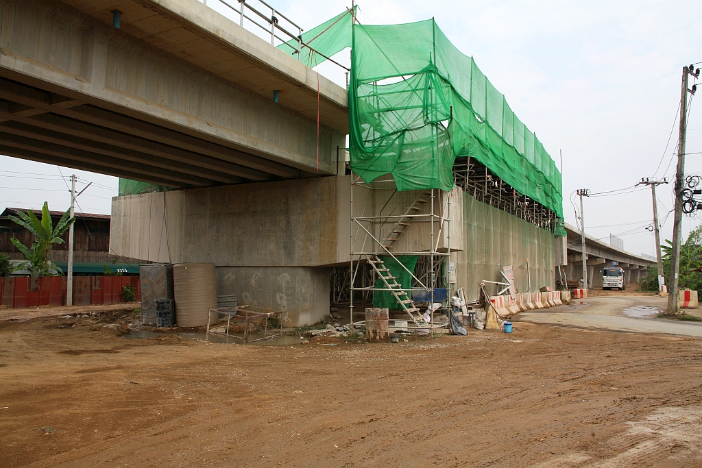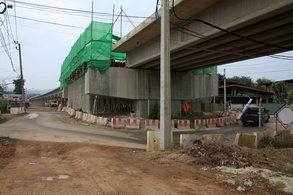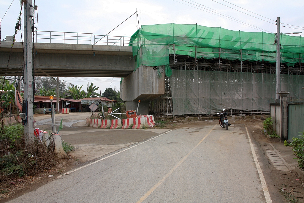Beim aktuellen Modernisierungsprogramm der SRT werden die Neu- und Umbaustrecken auch eingezäunt. - Im Bild vom 25.Februar 2026 so ein entstehender Zaun bei der Brückenbaustelle über den Highway 4004 im Ortsgebiet von Den Chai an der 323 km lange zweigleisige Neubaumeterspur-Strecke von Den Chai nach Chiang Khong (17.993625, 100.036183).