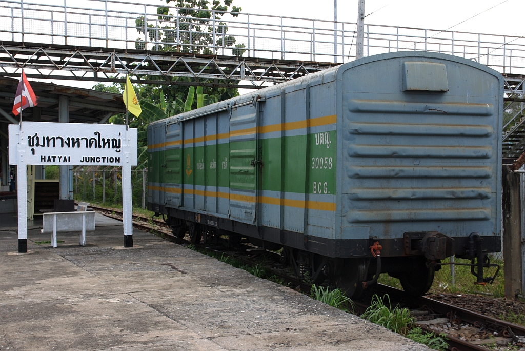 บ.ต.ญ. 25141 (บ.ต.ญ.=B.C.G./Bogie Covered Goods Wagon) an der Verladerampe des Bf. Den Chai am 09.Jän.2010.