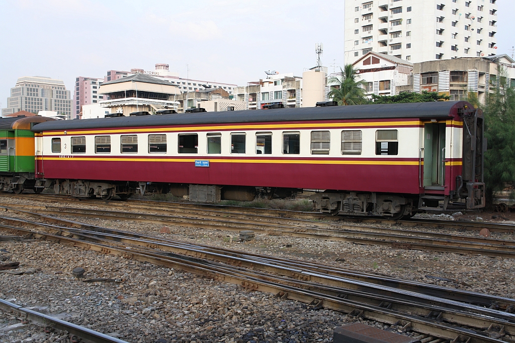 Mit verblasster Anschrift warten ein บสส. (=BST./Bogie Second & Third Class Carriage) und ein (บชท. =BSC./Bogie Second Class) am 23.März 2025 in der Sila At Station auf ihr weiteres Schicksal. Karl Seltenhammer