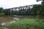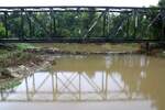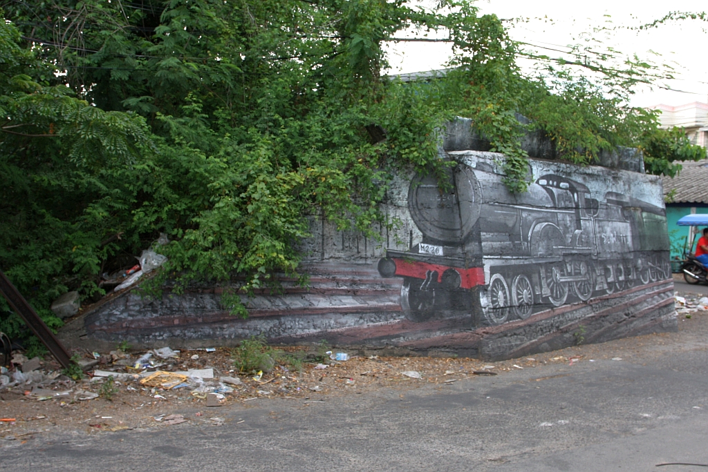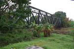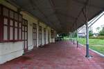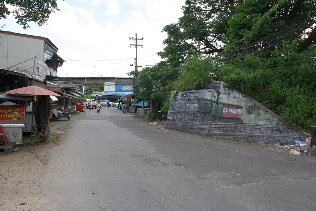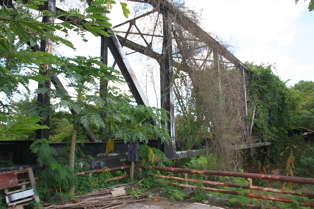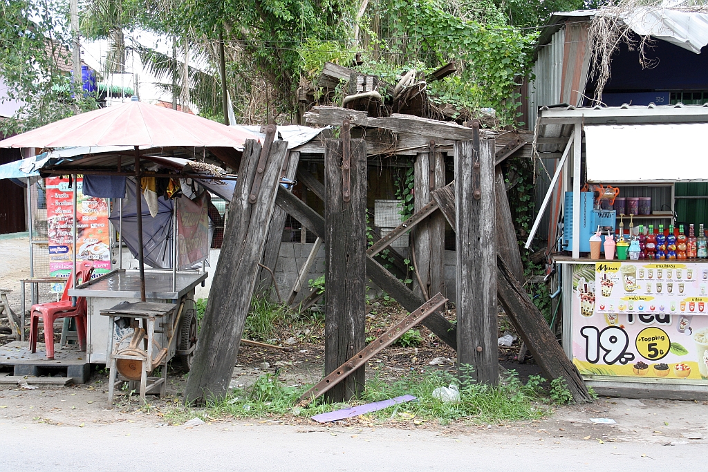 Von der 1978 eingestellten Bahnlinie Hat Yai Junction - Songkhla sind noch einige Relikte vorhanden. - Ungefähr beim Strecken-Km 931,10 gab es eine 60 Meter lange Holzbrücke über die Soi Saphandam. - Bis 2022 hingen noch die Schienen über die Straße, heute sind nur mehr das Widerlager und 2 hölzerne Brückenpfeiler vorhanden. - Im Bild vom 13.Mai 2025 das Widerlager.