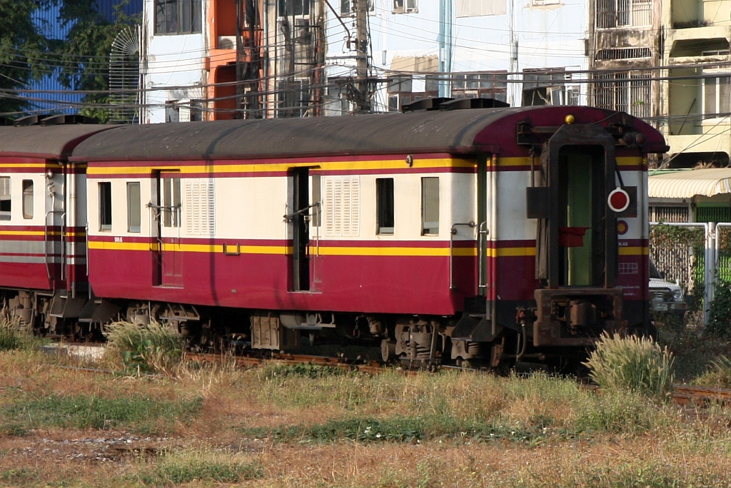 NKF 1237 als letztes Fahrzeug des Excursion 909 (Hua Lamphong - Nam Tok) fährt am 29.April 2023 in die Bang Sue Junction ein. Der vordere Zugteil ist der Excursion 911 (Hua Lamphong - Suan Soan Pradipat). Die beiden, an Samstag, Sonntag und Feiertags verkehrenden Züge werden bei der Hinfahrt bis Nakhon Pathom vereint geführt.