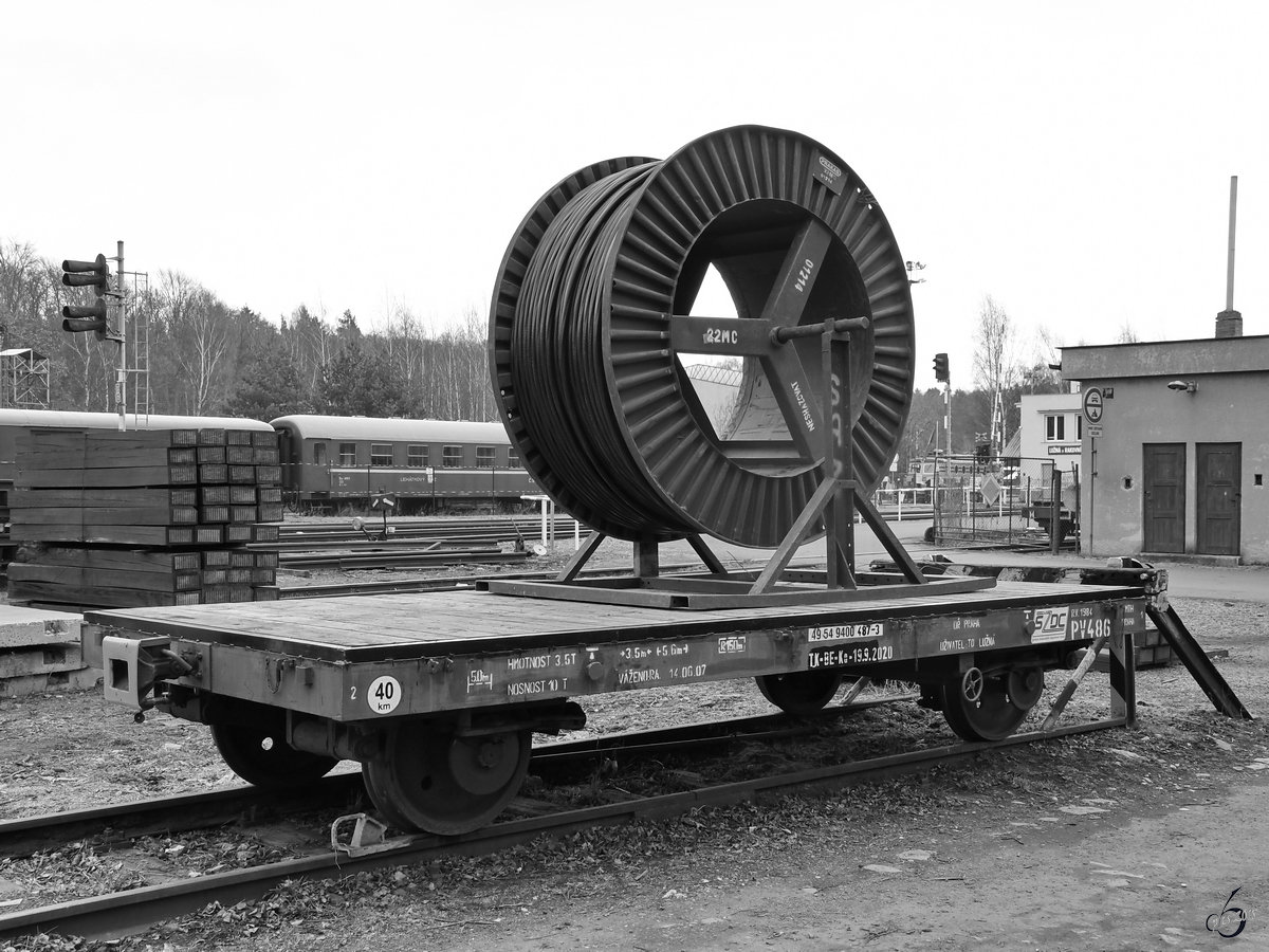 Ein mit einer Kabeltrommel beladener Arbeitswagen war im April 2018 in Lužná u Rakovníka abgestellt.
