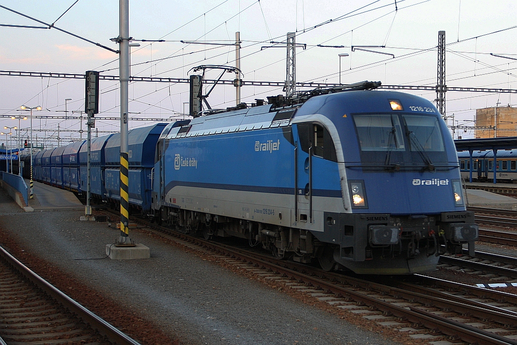 Die Kohle fährt scheinbar Railjet: ÖBB 1216 234-5 fährt am Abend des 18.August 2018 durch den Bahnhof Breclav.