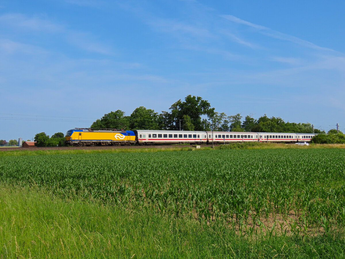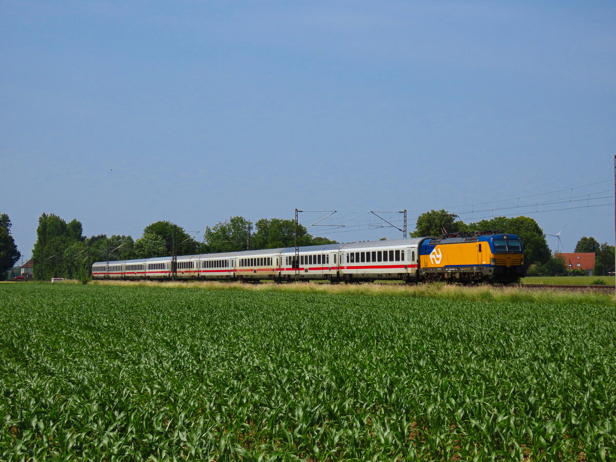 193 735 passiert mit dem Umleiter IC Hannover-Amsterdam über Altenbeken-Hamm-Münster-Rheine den Bahnübergang Widey in den Feldern zwischen Scharmede und Salzkotten. Ein paar Wochen später ist der Mais so hoch gewachsen, dass kein freier Blick mehr auf die Bahnstrecke möglich war. So waren die Bilder an den Feldern nur etwa zwei Wochen lang möglich, auch wenn die Umleiter über mehrere Monate fuhren. Juni 2025 Bern hard