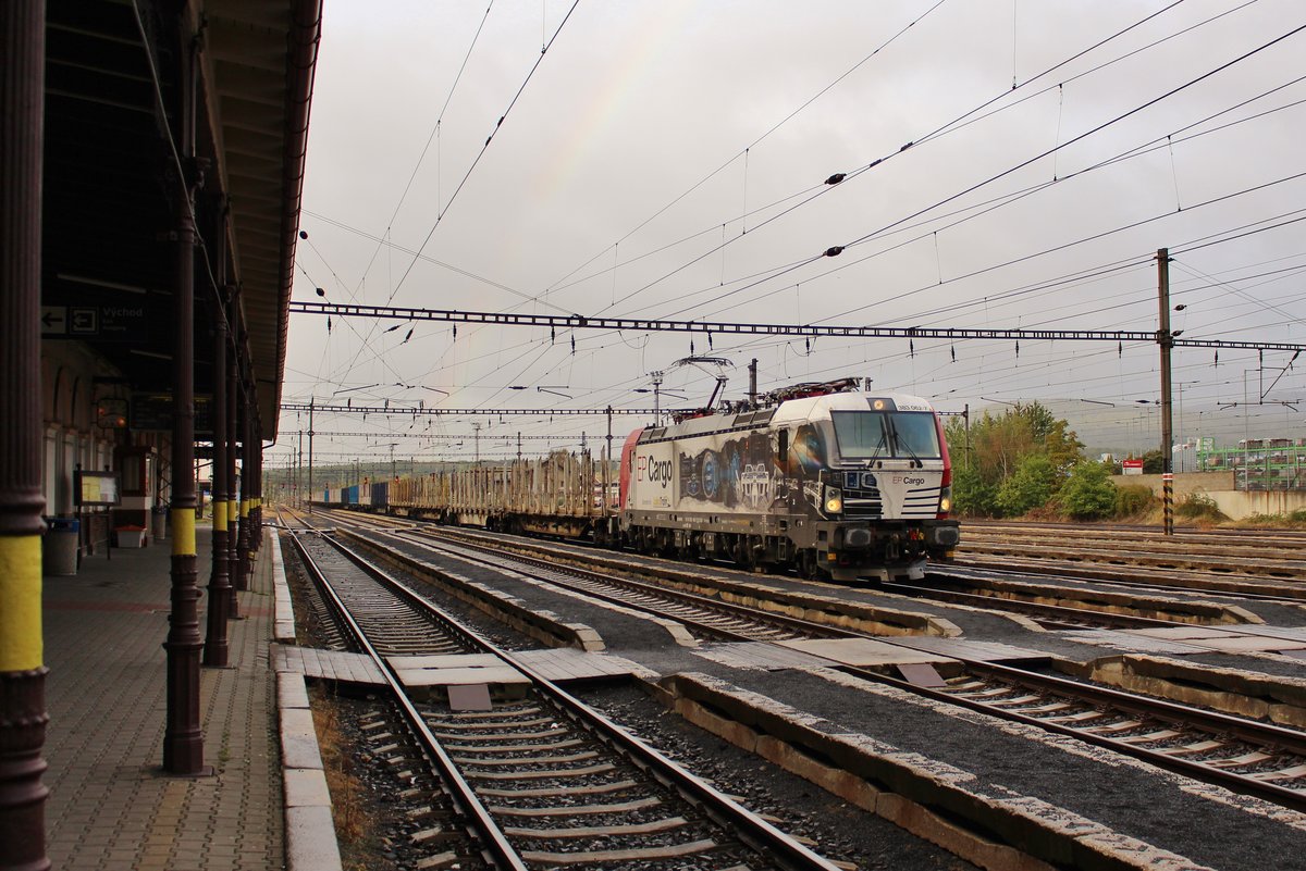 383 062-7 zu sehen am 03.10.19 mit einem leeren Holzzug in Chomutov.