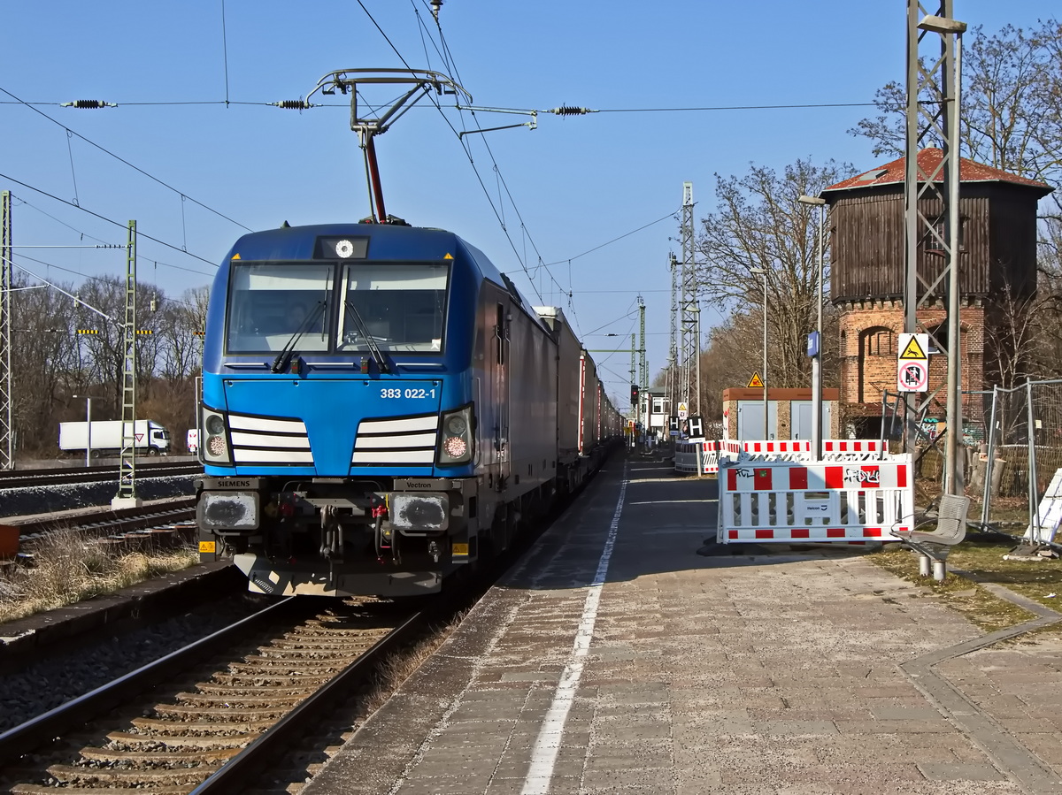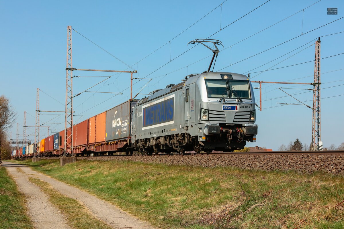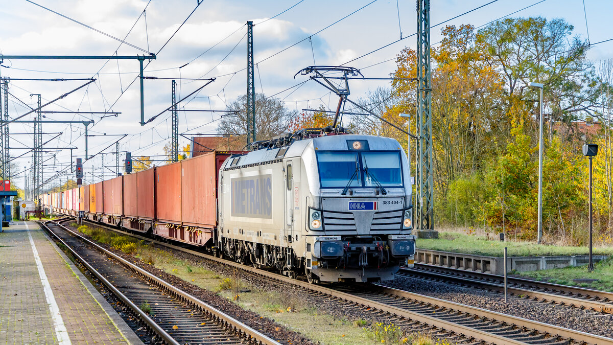 Mit einem Containerzug am Haken rollte der Metrans-Vectron 383 432 am bunten Farn in Wittenberg-Labetz vorbei Richtung Falkenberg(E).