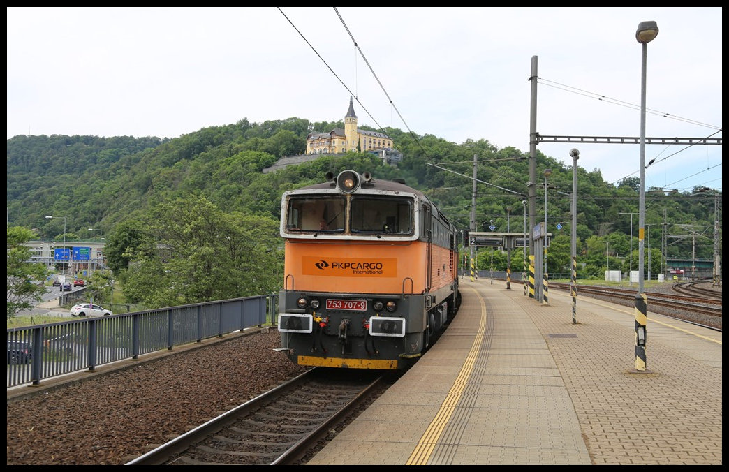 Zwei polnische Taucherbrillen machten mächtig Lärm, als sie am 5.6.2023 in Kralupy nad Vltavou abfuhren. PKP 735735-0 und ihre Schwesterlok machten sich um 10.13 Uhr mit einem schweren Kohlezug auf die Nebenstrecke in Richtung Kladno.