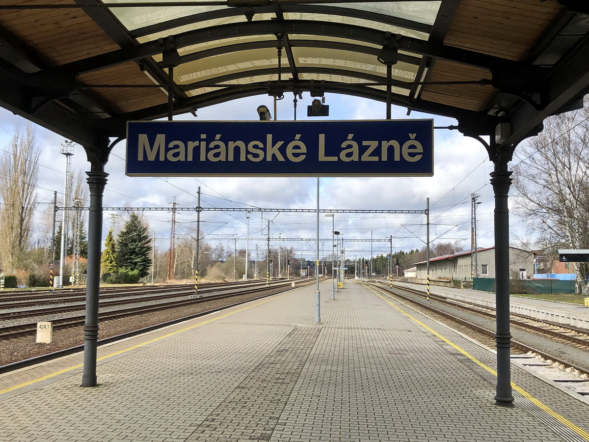 Blick vom Bahnsteig der Bahnhofs Marianske Lazne/Marienbad am 01. März 2020