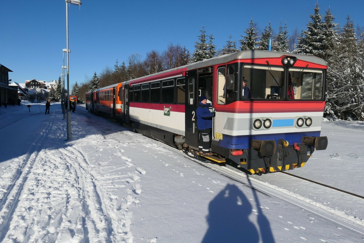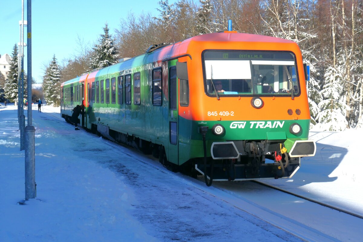 Plakat vor dem Bahnhof Moldava, weist auf die Geschichte der Strecke Nossen- Freiberg-Moldva- Brüx (Most) hin.