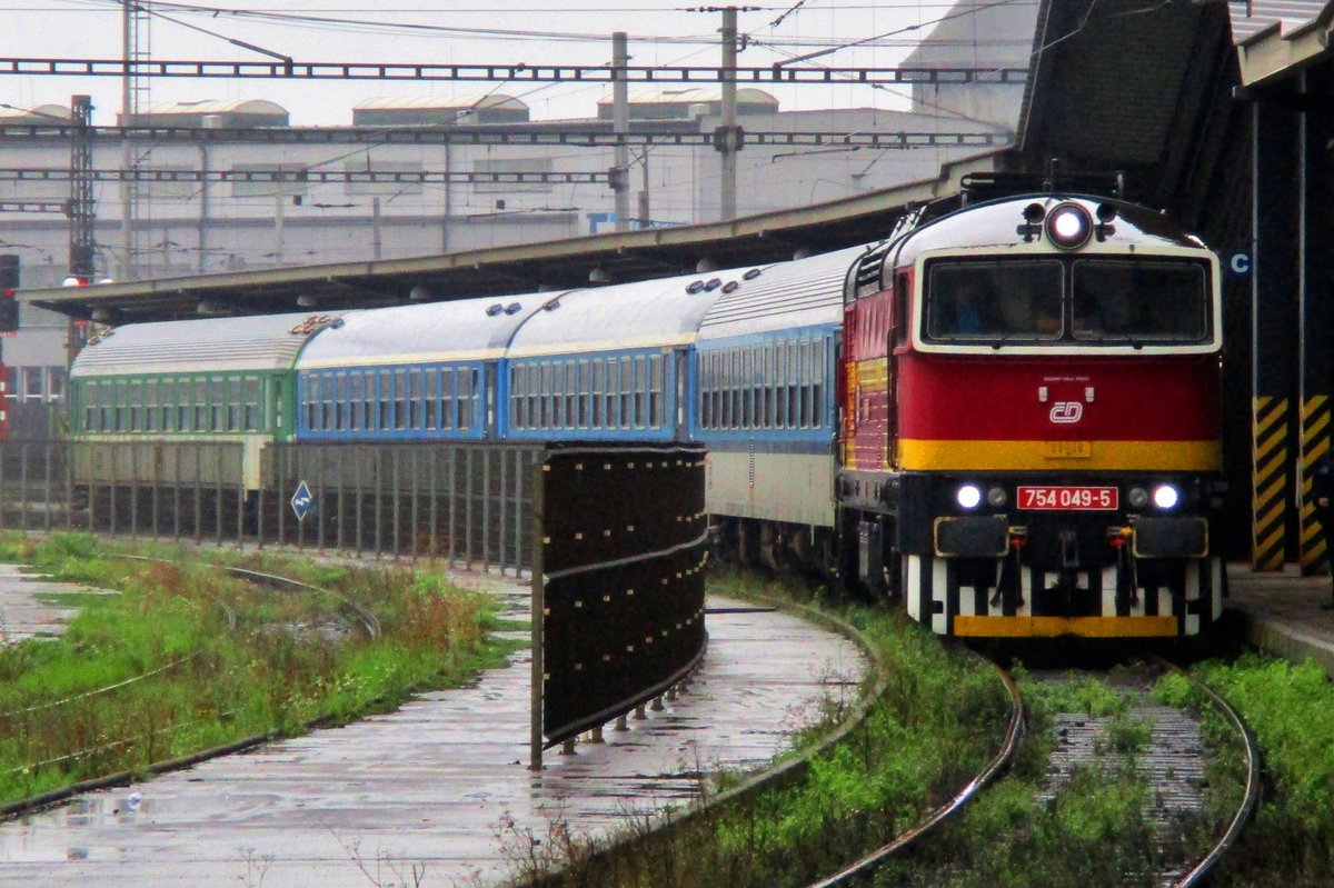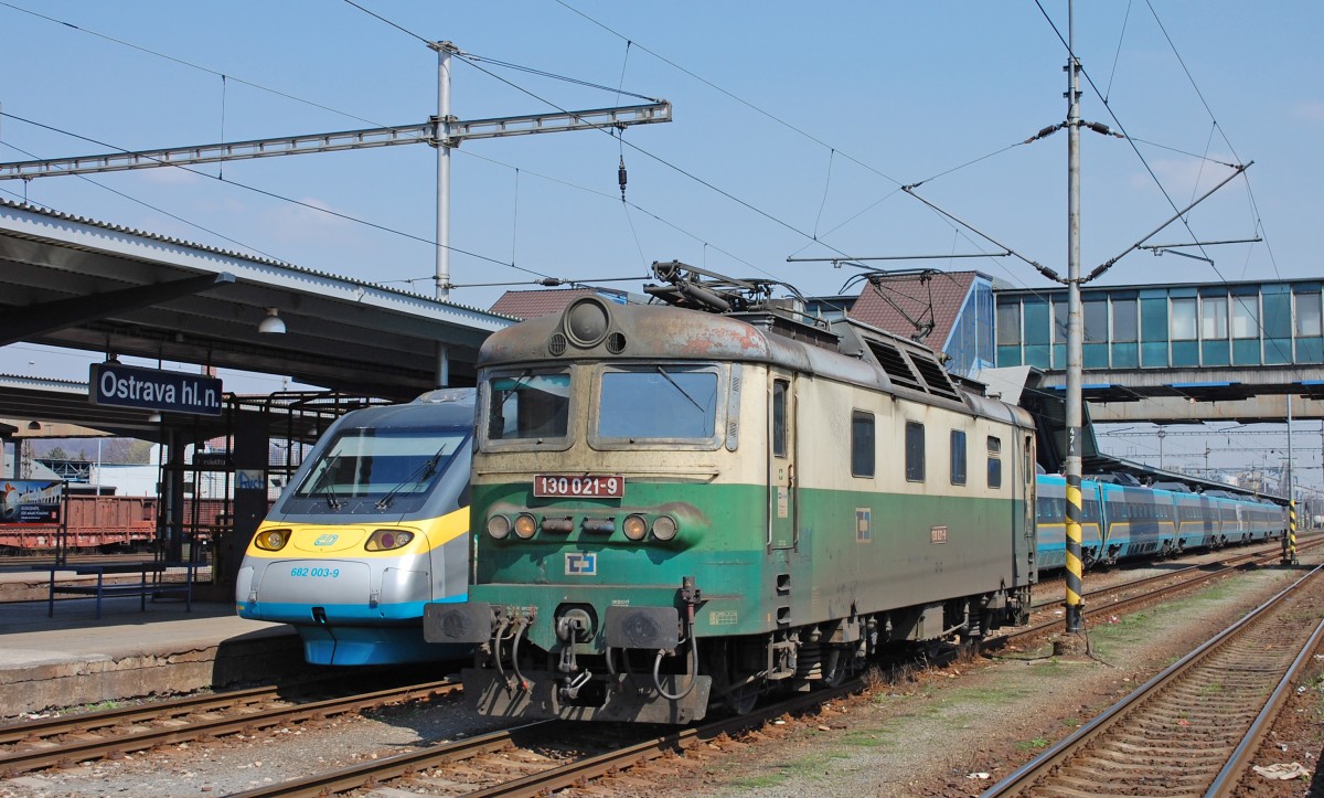 Ostrauer Hauptbahnhof liegt an der ehem. Kaiser-Ferdinands-Nordbahn, Blick in Richtung Bohumín/Oderberg. PKP-Intercity-Züge EC 102 „Polonia“ Villach – Warschau und EC 105 „Sobieski“ Warschau – Wien sind gerade in der Gleisanlage; 18.04.2012