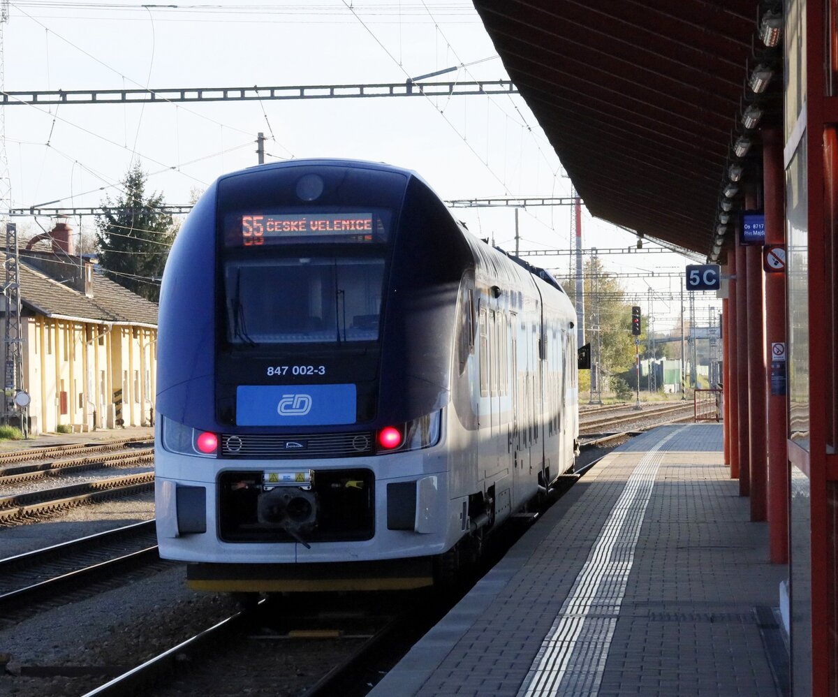 847 002-2 abfahrbereit Richtung České Velenice (deutsch Gmünd-Bahnhof, ursprünglich Unterwielands), es ist eher eine Nebenstrecke die über Trebon führt, allerdings 3x am Tage verkehrt auf dieser Strecke der Schnellzug Silva Nortica Prag-Wien Franz Joseph Bahnhof. 01.11.2024 15:39 Uhr.In Veselí nad Lužnicí .