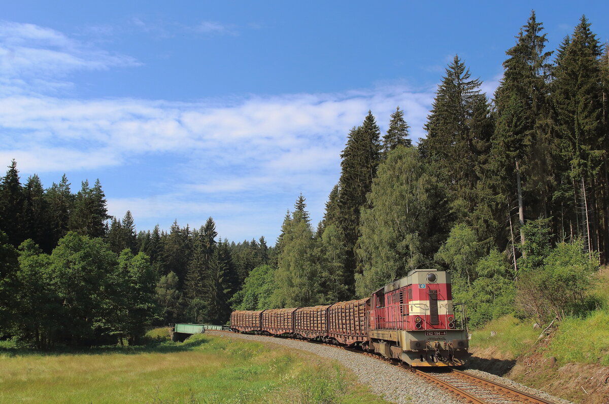 Die 742 194 rangiert leere Gigawood Wagen ins Ladegleis am Bahnhof von Tepla. Aufgenommen am 10.7.2025