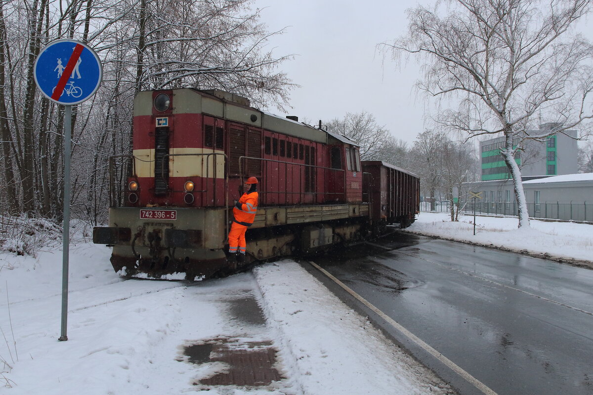 Gleich fährt die 742 396 mit Ea wagen in den Anschluss zum Schrotthändler hinein. Der Rangiergehilfe der die Straße vorher mit Absicherte und das Tor auf Schloss ist schon wieder auf der Lok bereit. Aufgenommen wurde die Szene am 29.01.2026 bei Dolny Rychnov. Andreas Schreiber
