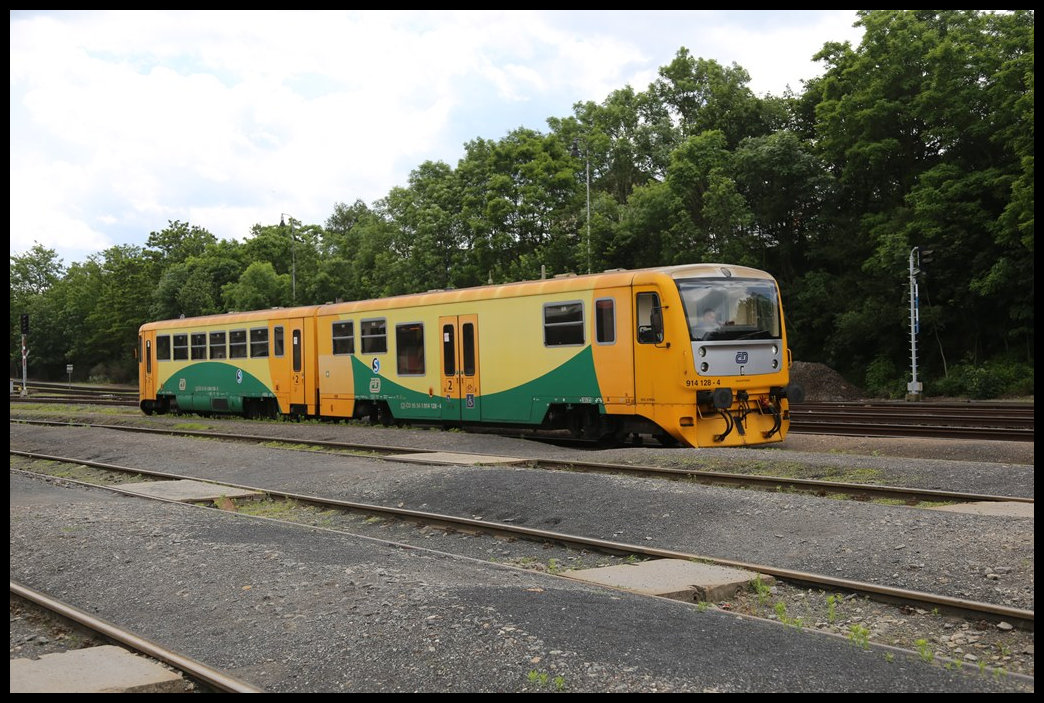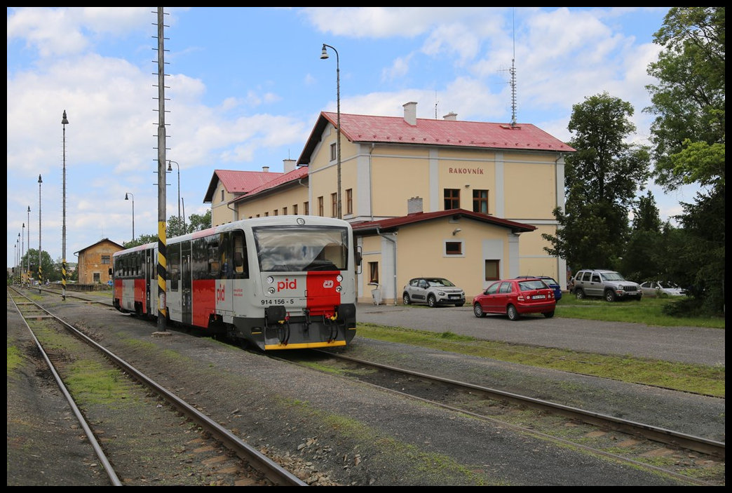 PID VT 914156-5 steht am 7.6.2024 um 11.57 Uhr am Bahnsteig im Bahnhof Rakovnik. Der Zug endet hier; denn es geht an diesem Tag in Richtung Westen nur im Schienen Ersatz Verkehr weiter.