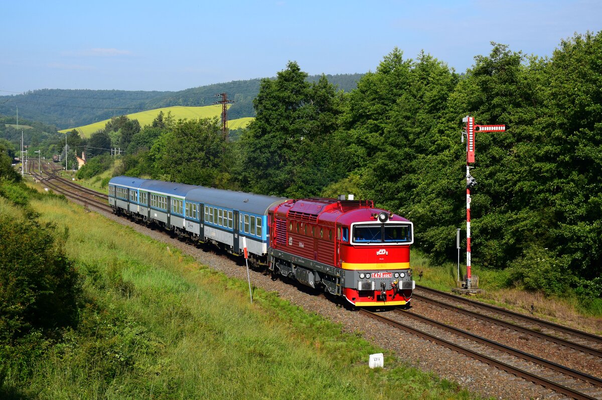Auf dem Bild fährt er mit dem Zug Sp 1762 von Bojkovice nach Brünn kurz nach Nemotice.