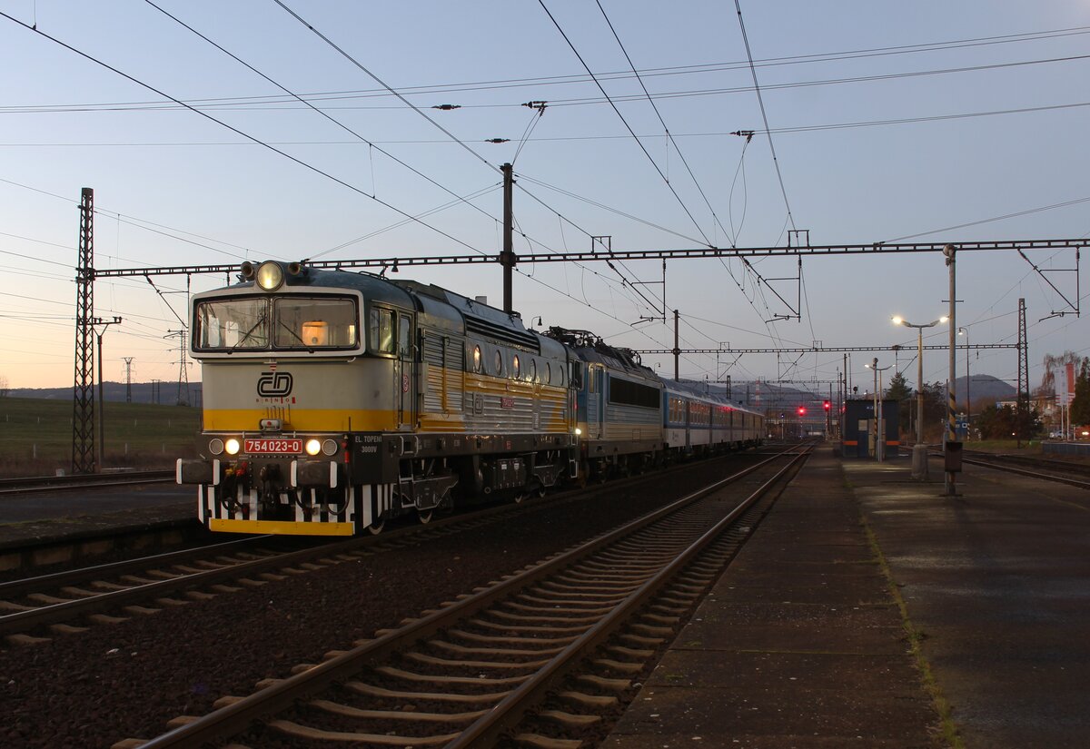 Am 18.11.25 gab es eine Stromabschaltung zwischen Chomutov und Kadan Prunéřov. 754 023-0 hat 362 121-6 mit Sp 1947 in Kadan Prunéřov am Haken.