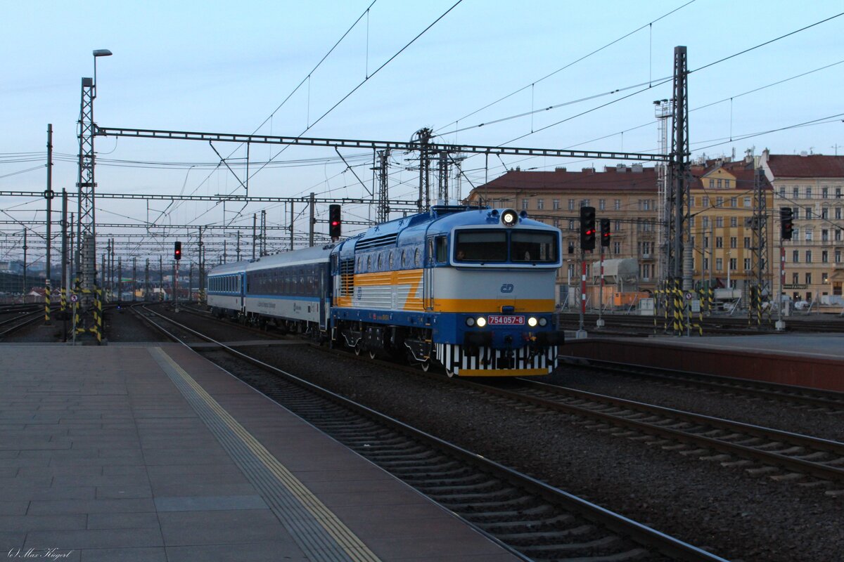 Ein Schnellzugpaar verbindet täglich die beiden Touristenmagnete Prag und Krumau. Am 15. August beförderte die 754.021 den IC 533  Jižní expres  von Praha hl.n. nach Český Krumlov auf dem letzten nicht elektrifizierten Streckenabschnitt. Bei Třísov konnte ich die im sogenannten Najbrt 2 Design gehaltene  Taucherbrille  mit den aus ehemaligen ÖBB Eurofimawagen gebildeten Zug aufnehmen.