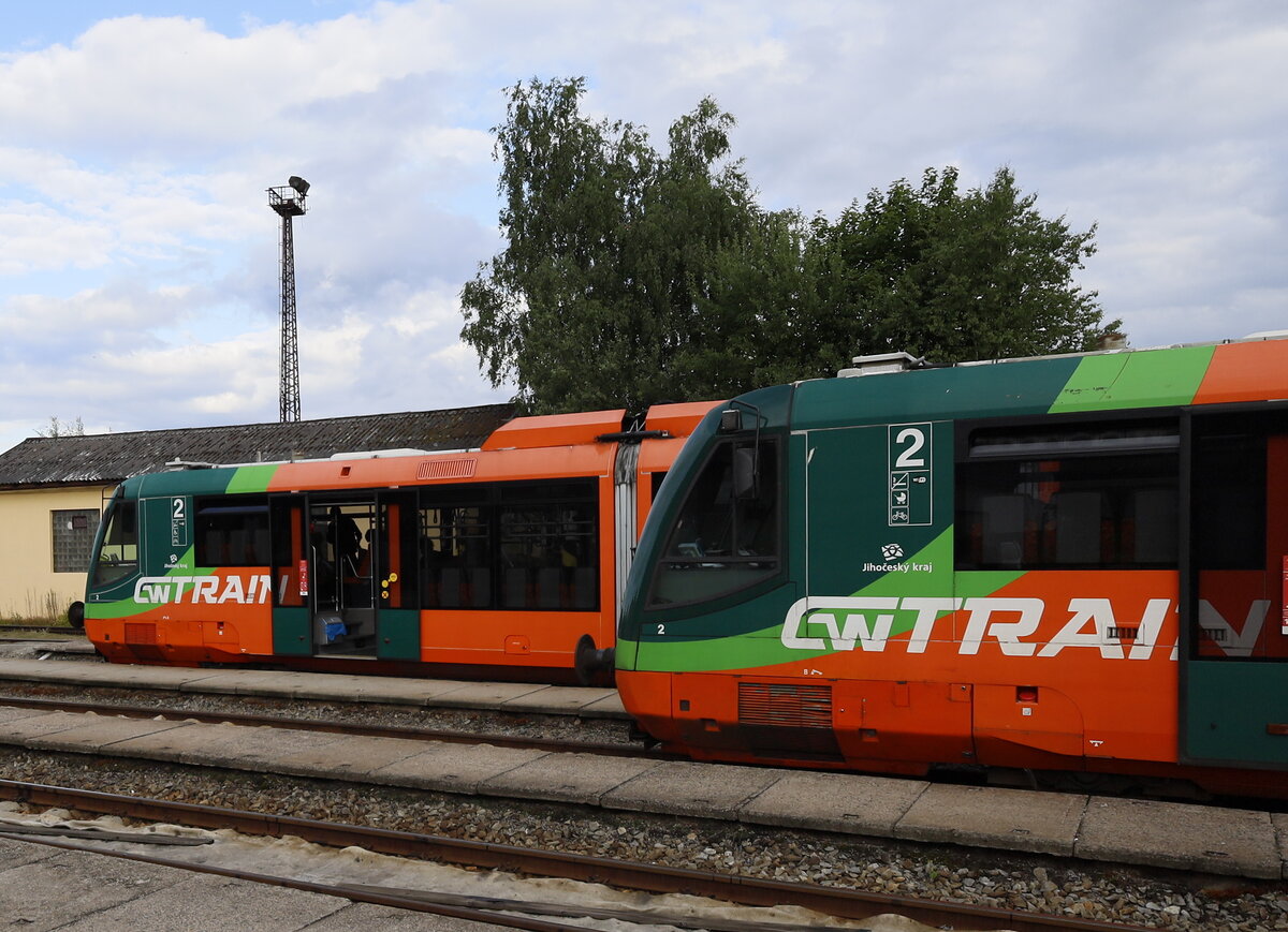 Zugkreuzung am 27.06.2025 um 09.03 Uhr im Bahnhof Zbytiny. Links steht abfahrbereit der GW Train 818017-6 nach Nove Udoli und rechts daneben steht der GW Triewagen 816004-6 aus Novwe Udoli. Gerd Hahn