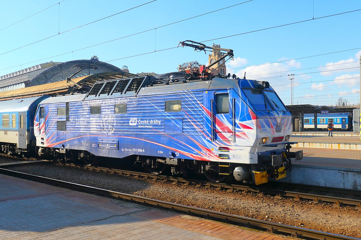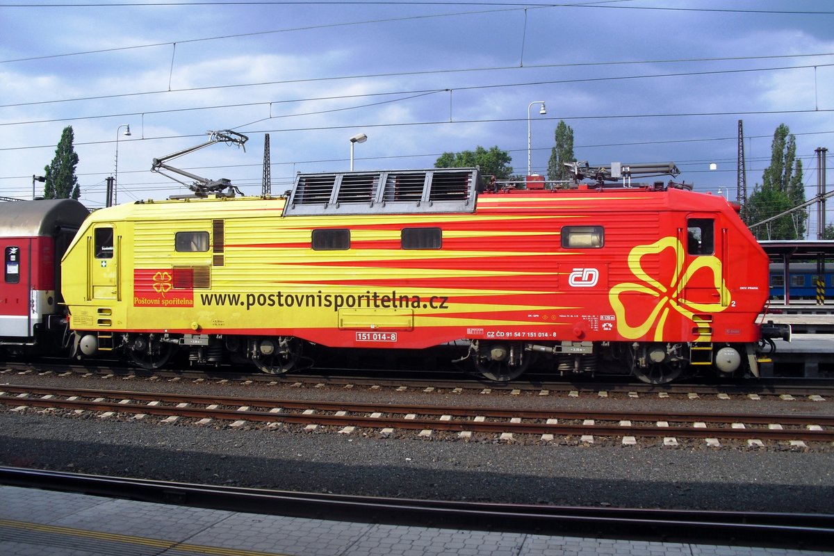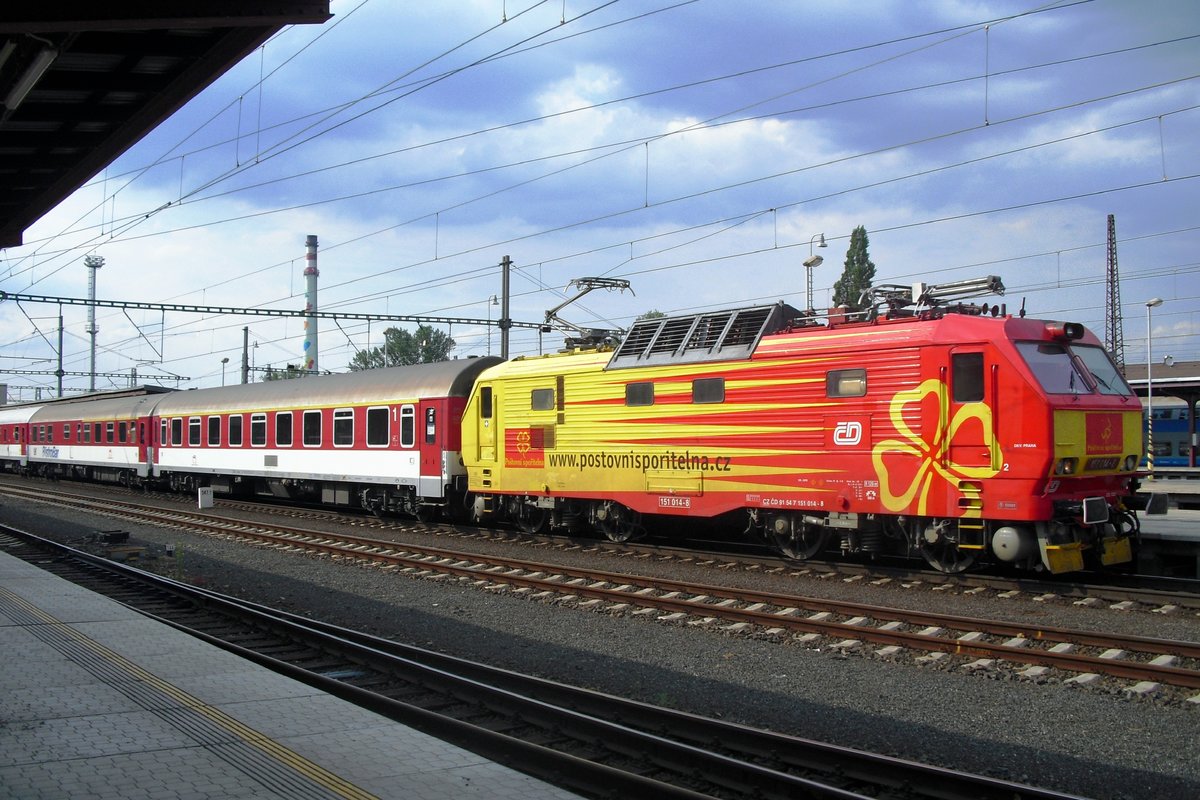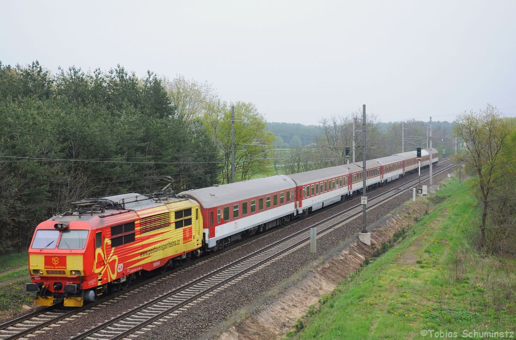 151 014 (CZ-CD 91 54 7151 014-8) mit Ex150 "Hukvaldy" von Žilina nach Praha hl.n. am 29.04.2013 bei Kolín