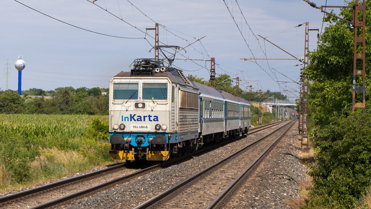 11. Juli 2019 in Velké Zbozí: 163 094-6 unterwegs mit dem Schnellzug nach Kolin.