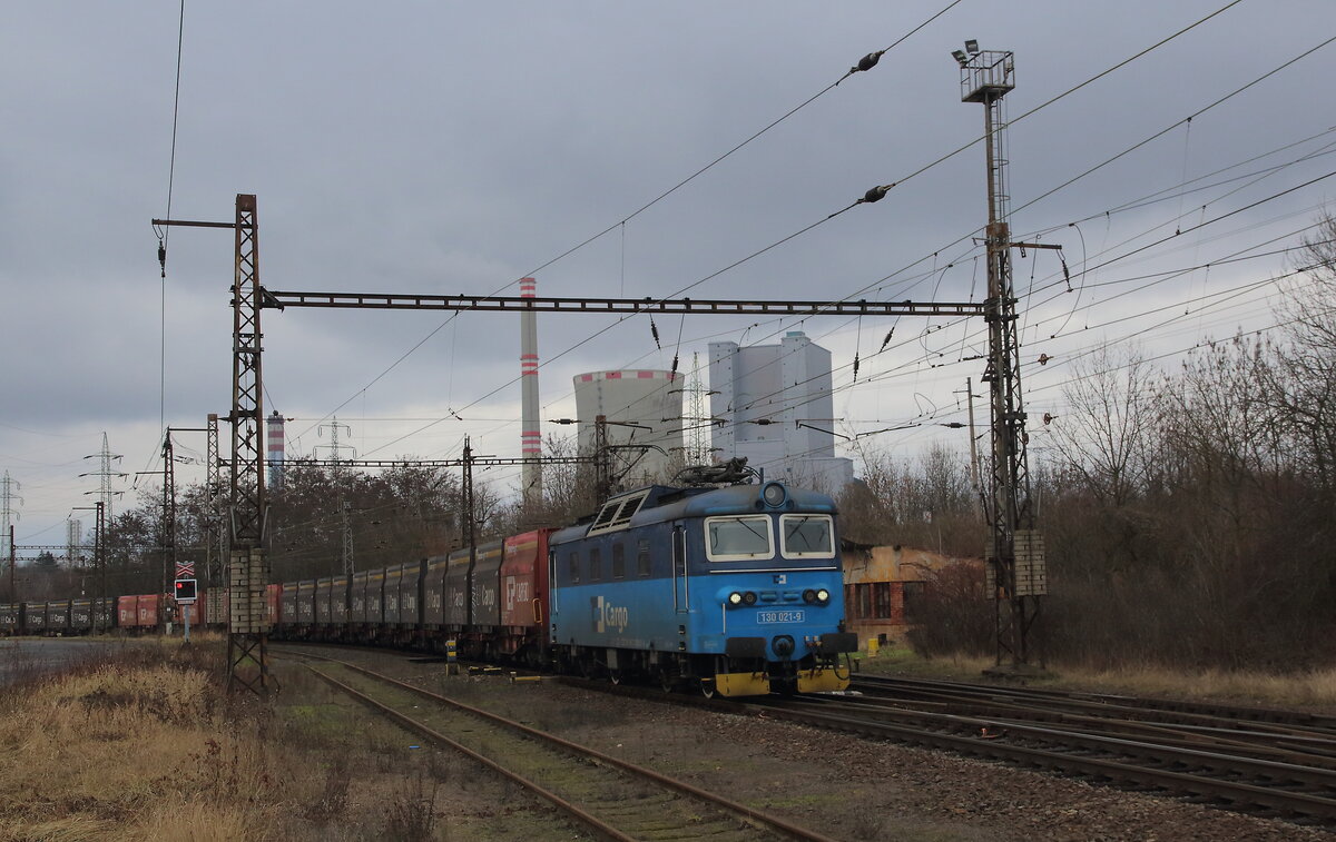 Ein Kohlezug mit Innofreight Containern fuhr aus Richtung Bilina am 14.02.2026 mit der 130 021 in Richtung Usti nad Labem. Mit Auf dem Bild zu erkennen das Kohlekraftwerk Ledvice Andreas Schreiber