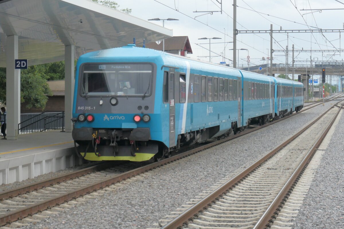Auch der Schnellzug von Liberec nach Pardubice wird im Jahr 2024 von Arriva Vlaky bedient. Die setzen auch die ehemaligen DB 628 (jetzige Baureihe 845) ein, hier im völlig umgestalteten Bahnhof Rosice nad Labem