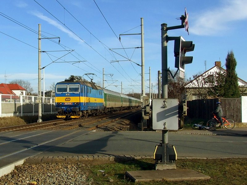 363 047-2 bespannte den Zug bis Vojtanov. Mein Motiv wählte ich in der Verbindung zwischen Tršnice und Františkovy Lázně. Denn hier fahren eigentlich keine Züge. Man sieht dies an den Gleisen und dem Funken den Stromabnehmers.