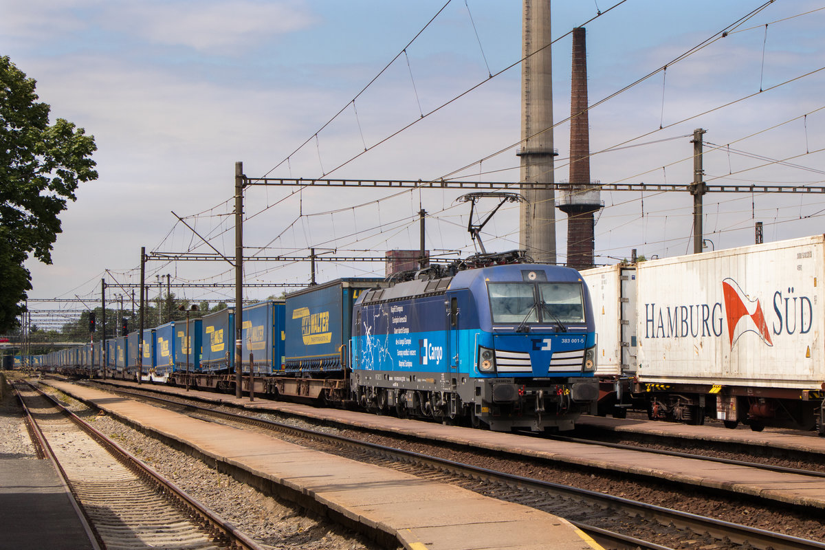 11. Juli 2019 in Nymburk: 383 001-5 mit Lkw-Walter südwärts.