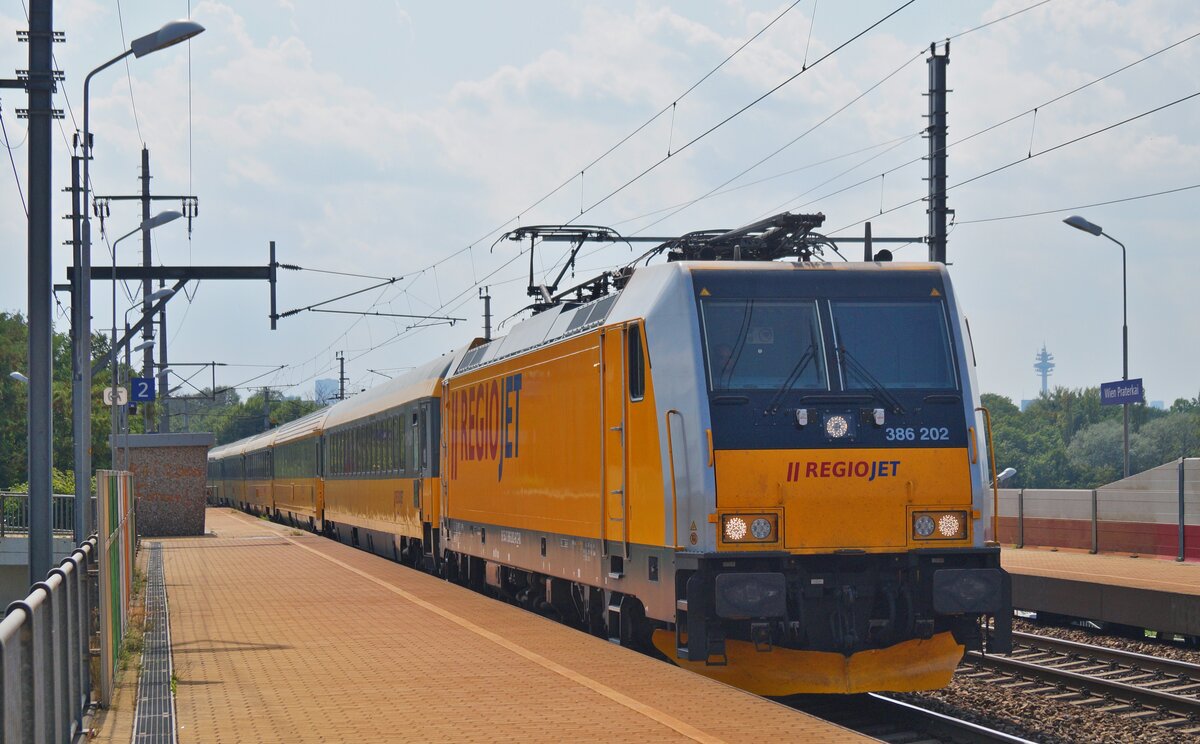 386 202 durchfuhr am 13.08.2020 mit dem RJ 1034 "RegioJet" (Wien Hbf - Praha hl.n.) die Haltestelle Wien Praterkai, die inzwischen auch schon modernisiert wurde. Bemerkenswert sind die im Zugverband mitgeführten ehemaligen ÖBB-Reisezugwagen, die damals großzügig verkauft wurden und heutzutage im österreichischen Reisezugverkehr fehlen. Markus