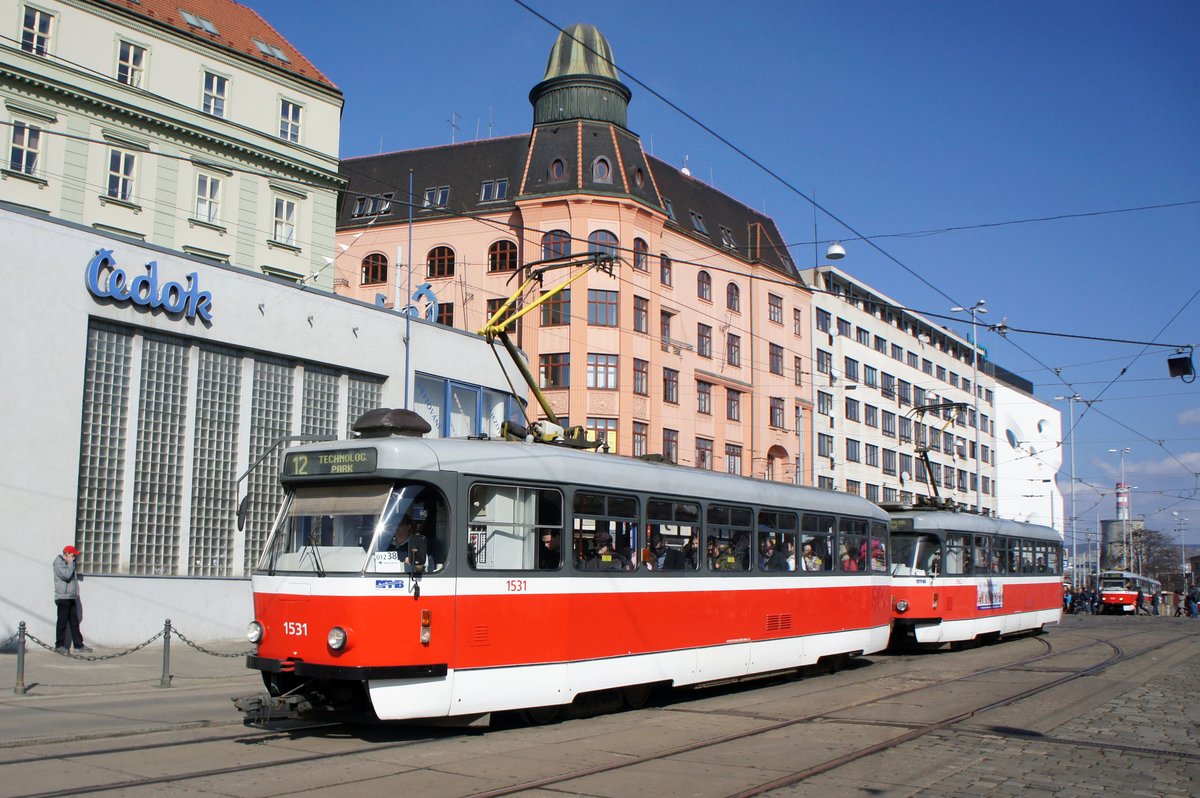Tschechien / Straßenbahn (Tram) Brno / Brünn: Tatra T3R.EV - Wagen 1531 sowie Tatra T3R.EV - Wagen 1562 von Dopravní podnik města Brna a.s. (DPMB), aufgenommen im März 2017 am Hauptbahnhof der tschechischen Stadt Brünn.