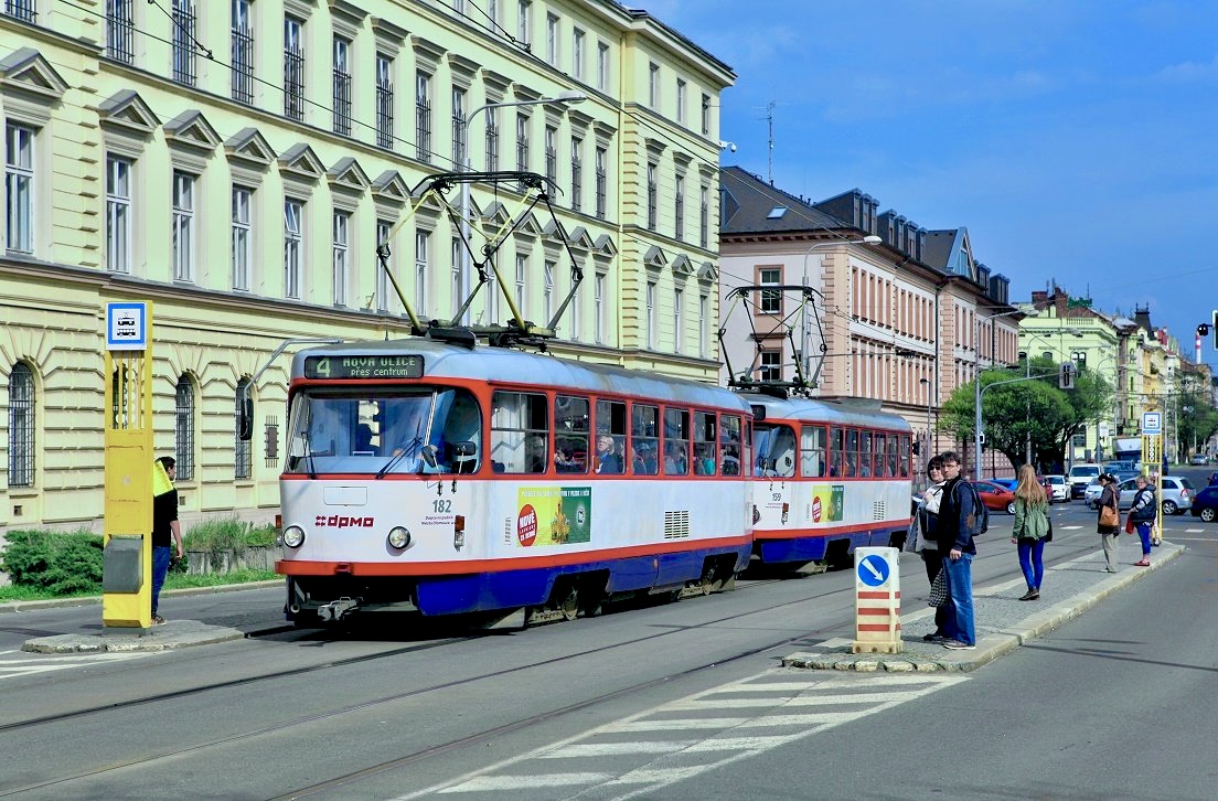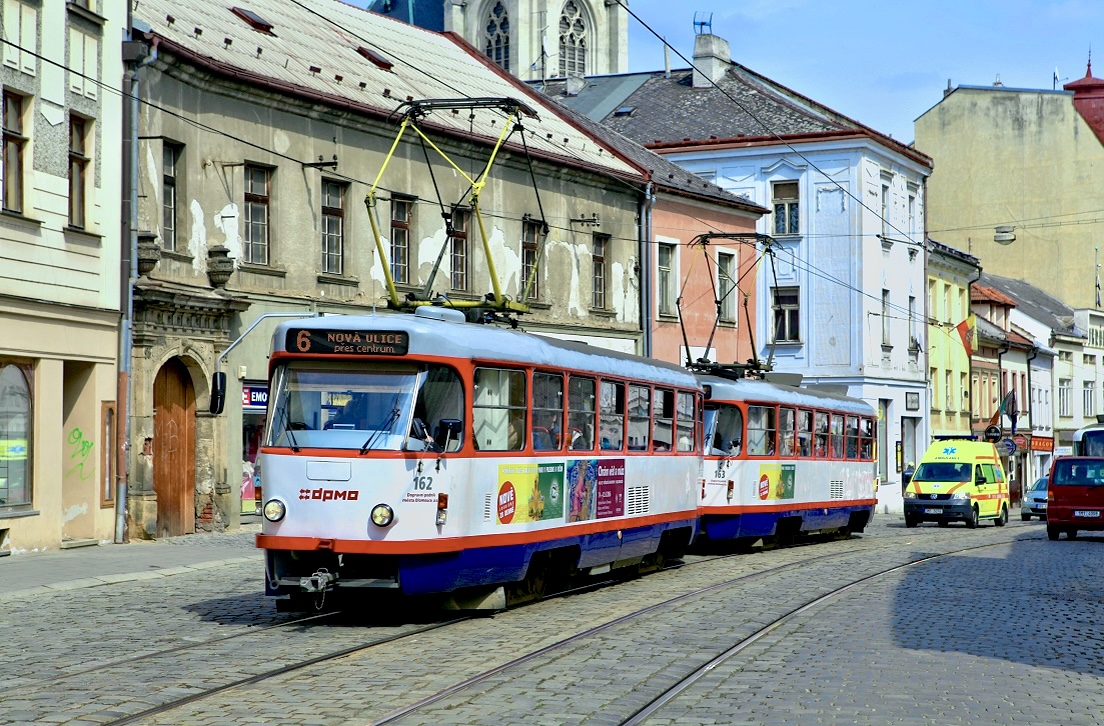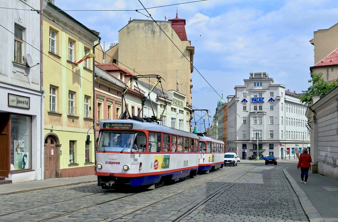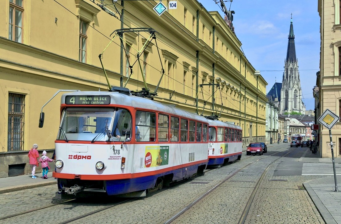 Heckansicht von Tram DPMO-237 (Vario LFR.E) unterwegs auf der Linie 4 in Olomouc hl.n.