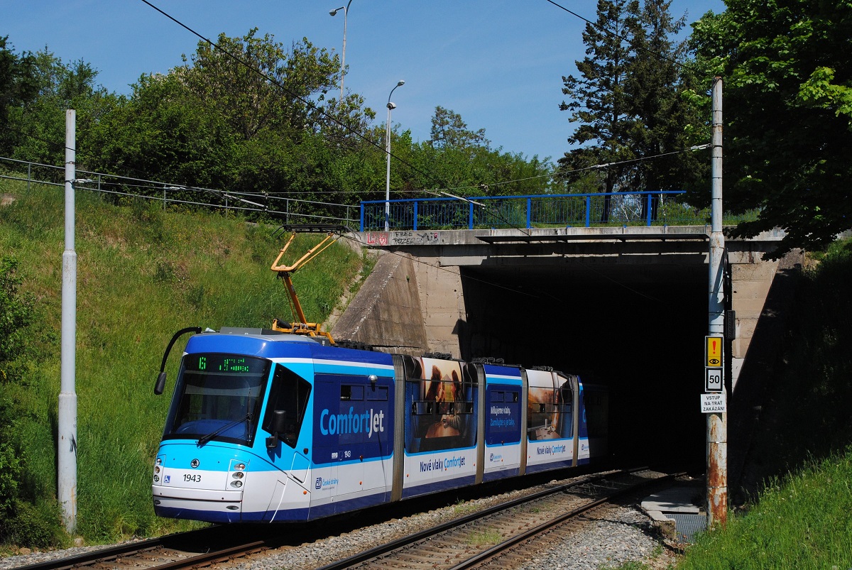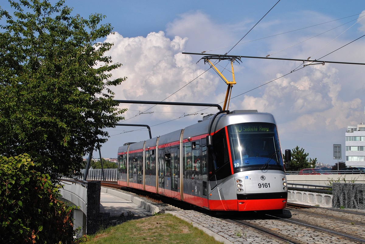 07. August 2010, Prag im Dauerregen. Die Straßenbahn kreuzt den Wenzelsplatz. Die Škoda 14 T sind (teilweise) niederflurige sechsachsige Multigelenkwagen in Einrichtungsbauart. Sie werden in Prag seit 2006 im Linienbetrieb eingesetzt. Hersteller ist Škoda Transportation Pilsen. Das Design entwarf Porsche Design. Die fünfteiligen Garnituren haben einen Gesamtlänge von 30 m, bieten Platz für 269 Fahrgäste und sind für eine Höchstgeschwindigkeit von 60 km/h zugelassen. Es befinden sich 60 Wagen mit den Nummern 9111 bis 9170 im Einsatz. (Quelle Wiki)
