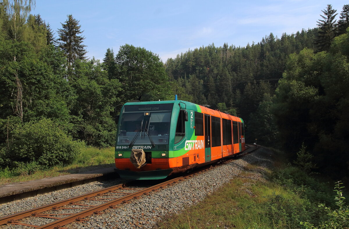 GW Train 818245-3 erreicht hier auf der Fahrt von Karlsbad nach Marienbad am 28.4.2024 um 11.29 Uhr den Kreuzungsbahnhof Becov nad Teplou.