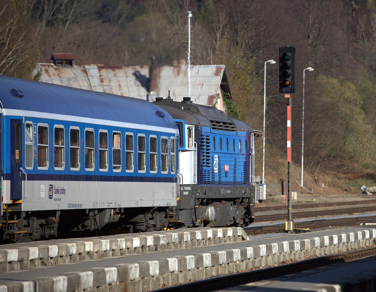 Ausfahrt nach Jeseník. Eine typische Lok der Baureihe 750 zieht den kurzen Schnellzug. 31.10.2019 10:31 Uhr.