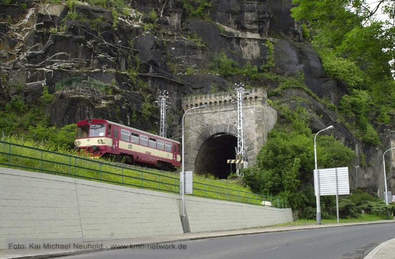 Ein Triebwagen der Baureihe 810 hat soeben den Tunnel aus Richtung Schöna verlassen und wird in wenigen Augenblicken in den Bahnhof Decin einfahren.