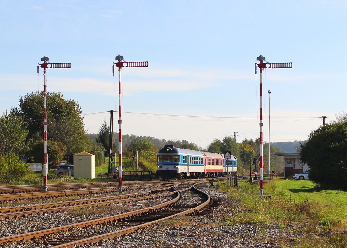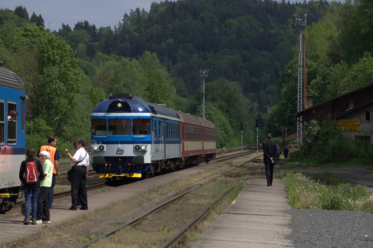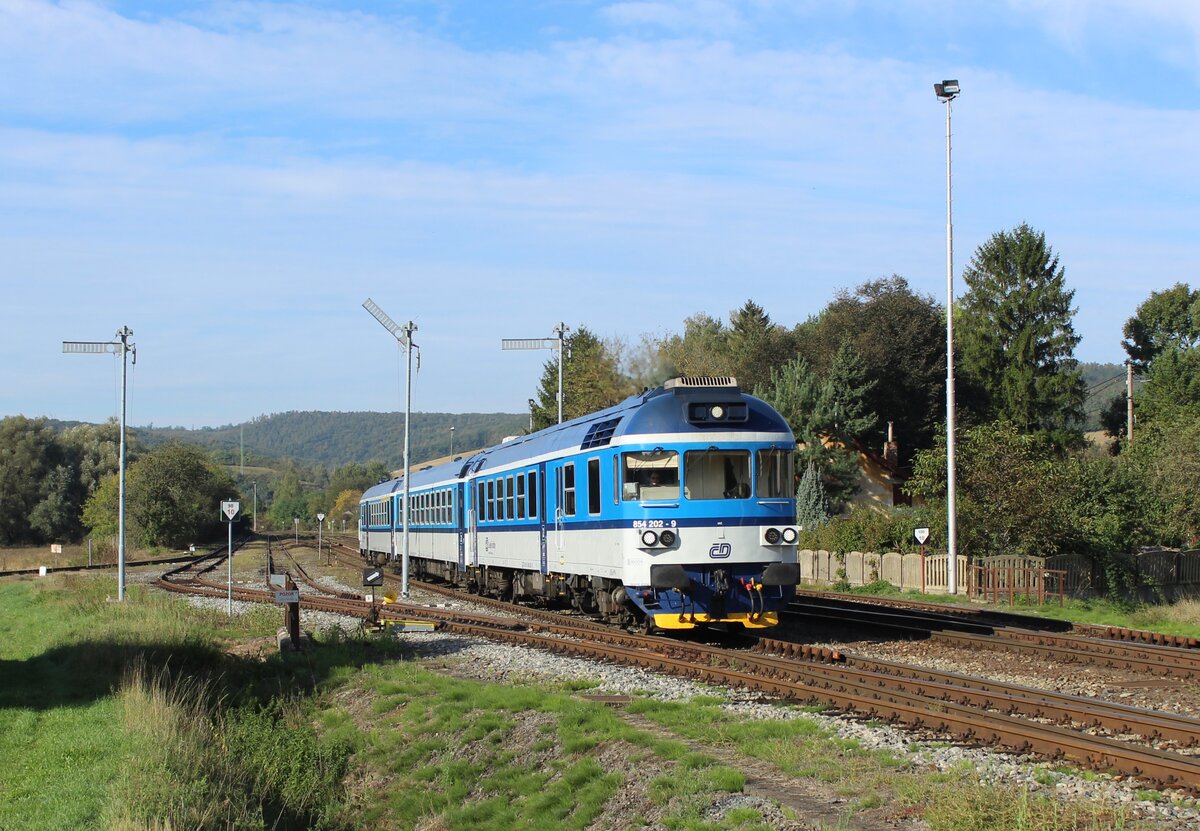 854 007-2 läuft in Zelezby Brod ein, um in wenigen Minuten gemeinsam mit 843 030-8 nach Turnov zu fahren