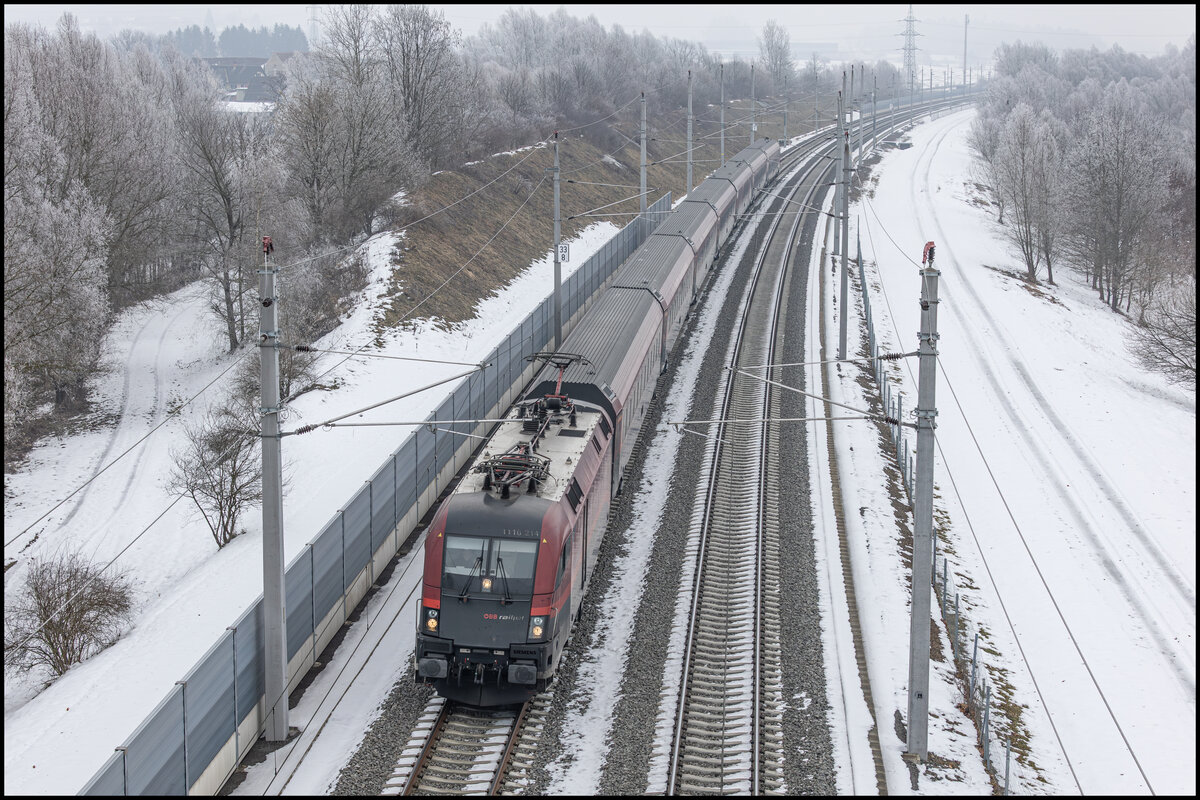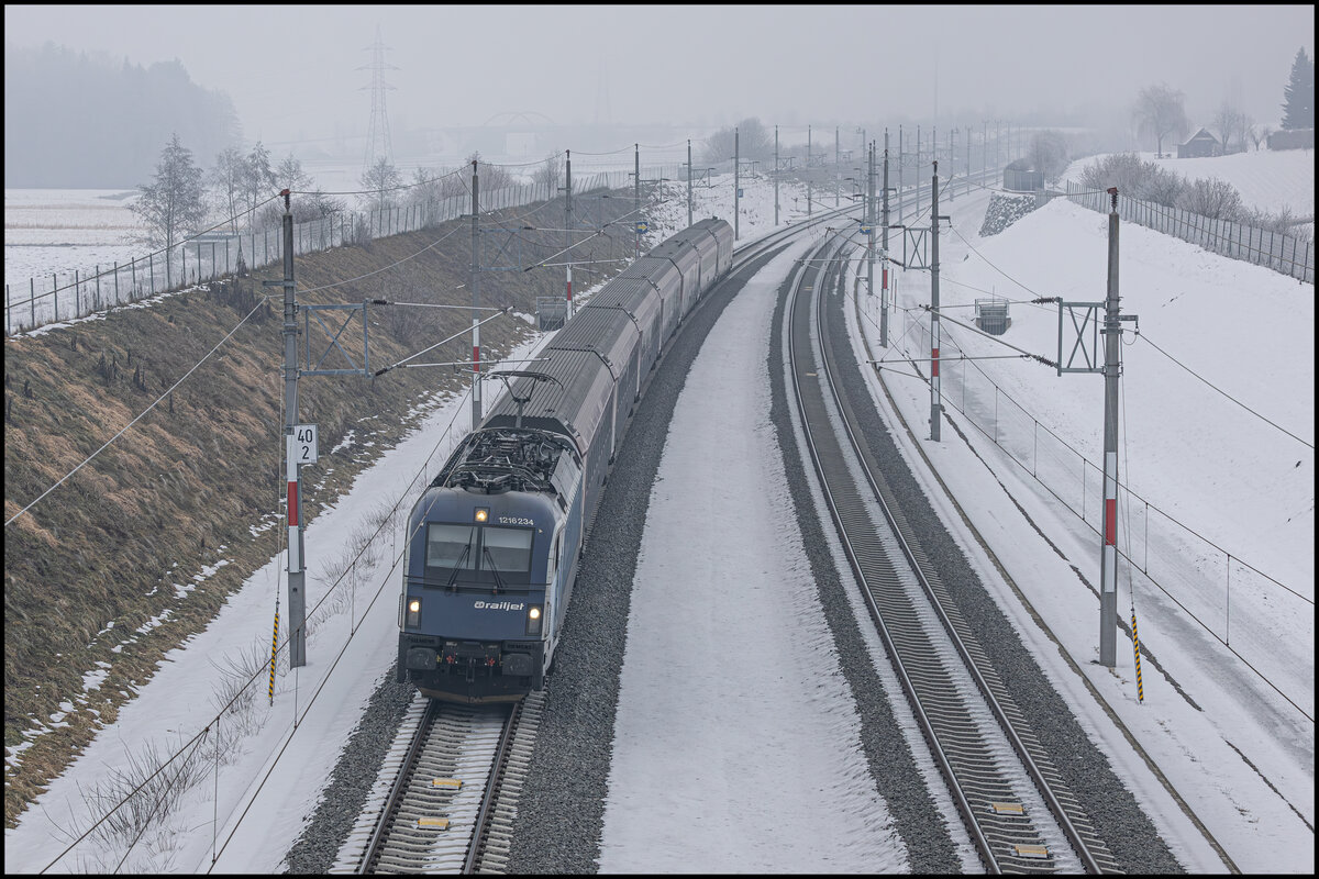 Bei Kaiserwetter fotografierte ich am 31.12.2025 den RJX 53  Vindobona  bestehend aus der 1216 228 sowie einer neunteiligen ComfortJet-Garnitur der České dráhy zwischen dem Bahnhof Weststeiermark und dem Ostportal des Koralmtunnels.
