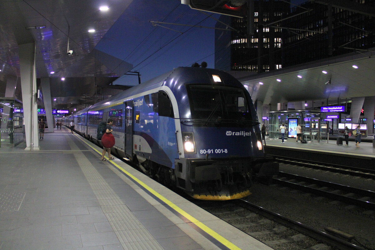 80-91 005 der České dráhy bildet den Zugschluss des RJ 73 (Praha hl.n. - Graz Hbf), der am 02.02.2025 den Wiener Hauptbahnhof pünktlich auf Bahnsteig 7 erreicht hat. Markus