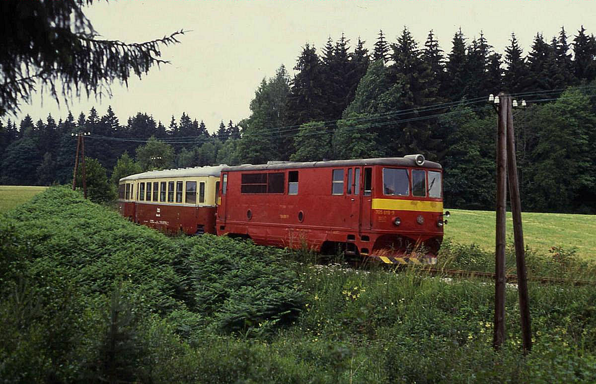 709919 ist am 6.7.1992 mit dem Zug 220806 nahe dem Haltepunkt Lovetin unterwegs nach Obratan.