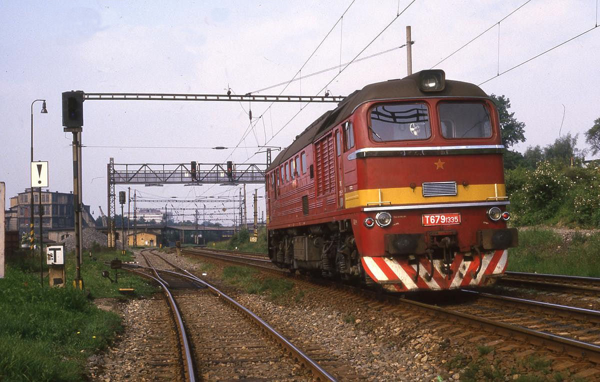 Während rechts T 6791159 am 19.6.1988 auf Einfahrt in das Depot Sokolov wartet, rollt Schwesterlok T 6791529 mit gut besetztem Führerstand mit einem Kohlezug aus