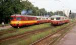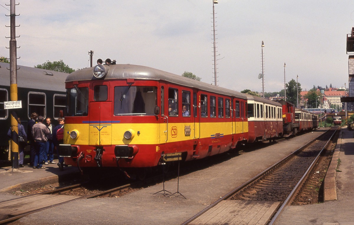 Dieseltriebwagen der CSD: Zwischen 1959 und 1964 stellte die CSD für den Regionalverkehr 122 Triebwagen der Reihe M 240.0 (später 820) in Dienst. Während die Triebwagen bis 2001 ausgemustert wurden, wurden die letzten Beiwagen erst 2019 abgestellt. Im Frühjahr 1998 steht eine dreiteilige 820-Garnitur abfahrbereit im Bahnhof Karlovy Vary. Horst Lüdicke