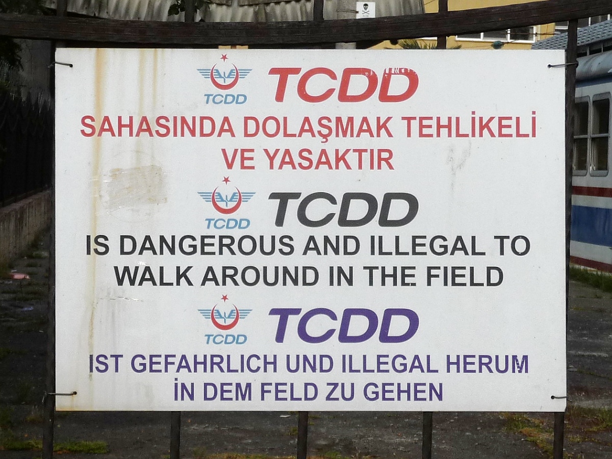 Warnschild am Zaun des Kopfbahnhofs von Adapazari (Sakarya, Türkei), 24.4.16.