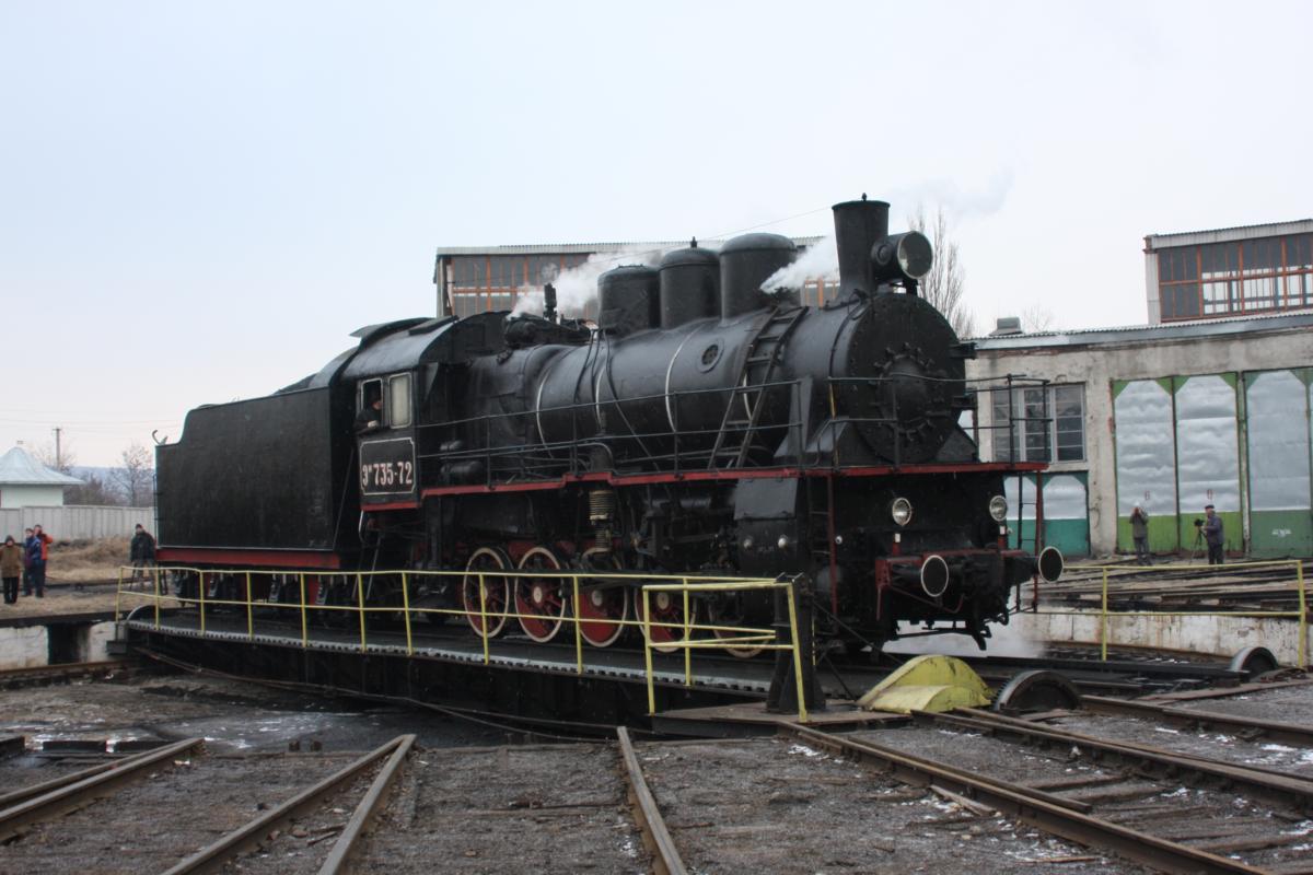 Eine Kaluga, Rangierlok einer ukrainischen Privatfirma, fährt am 18.02.2008 auf die Drehscheibe im Depot Czernowitz.