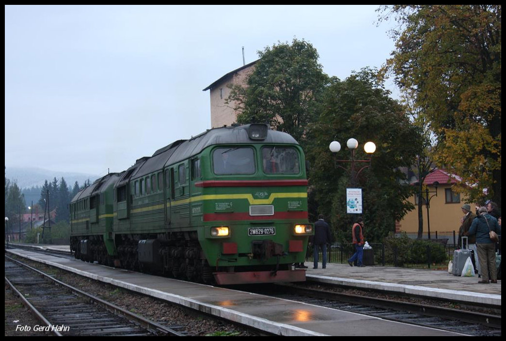 Die Doppellok 2M62U-0159 aus dem Depot Kobel zieht hier den Zug Rachiv-Kiew.
