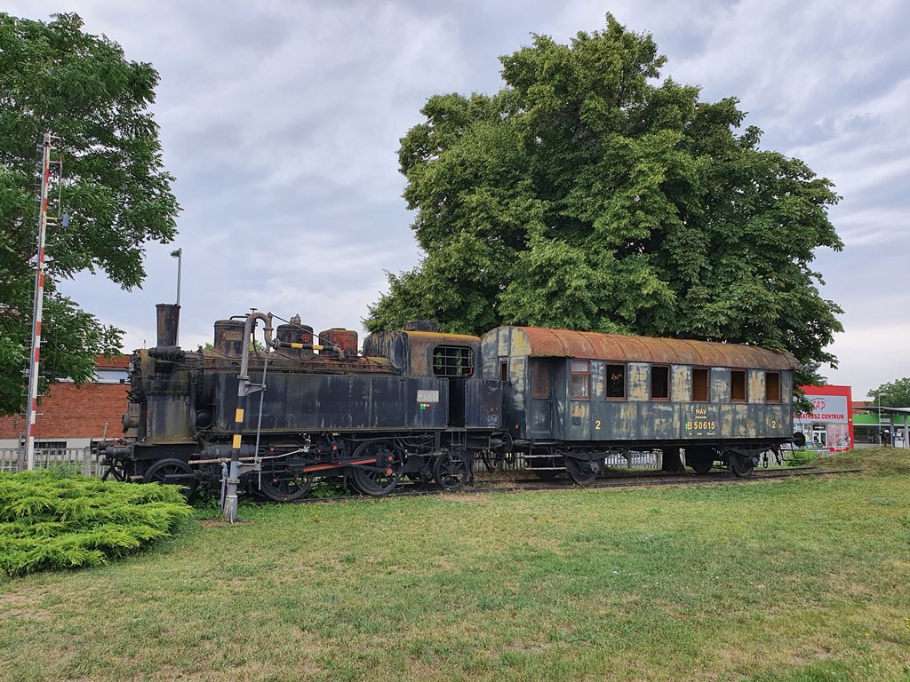 Bahnhof Celldömölk am 15.7.2022: Als Denkmal steht dort die 1B1 Tenderlok 275 052 der MAV mit einem Personenwagen in einem derzeit bedauernswerten Zustand!