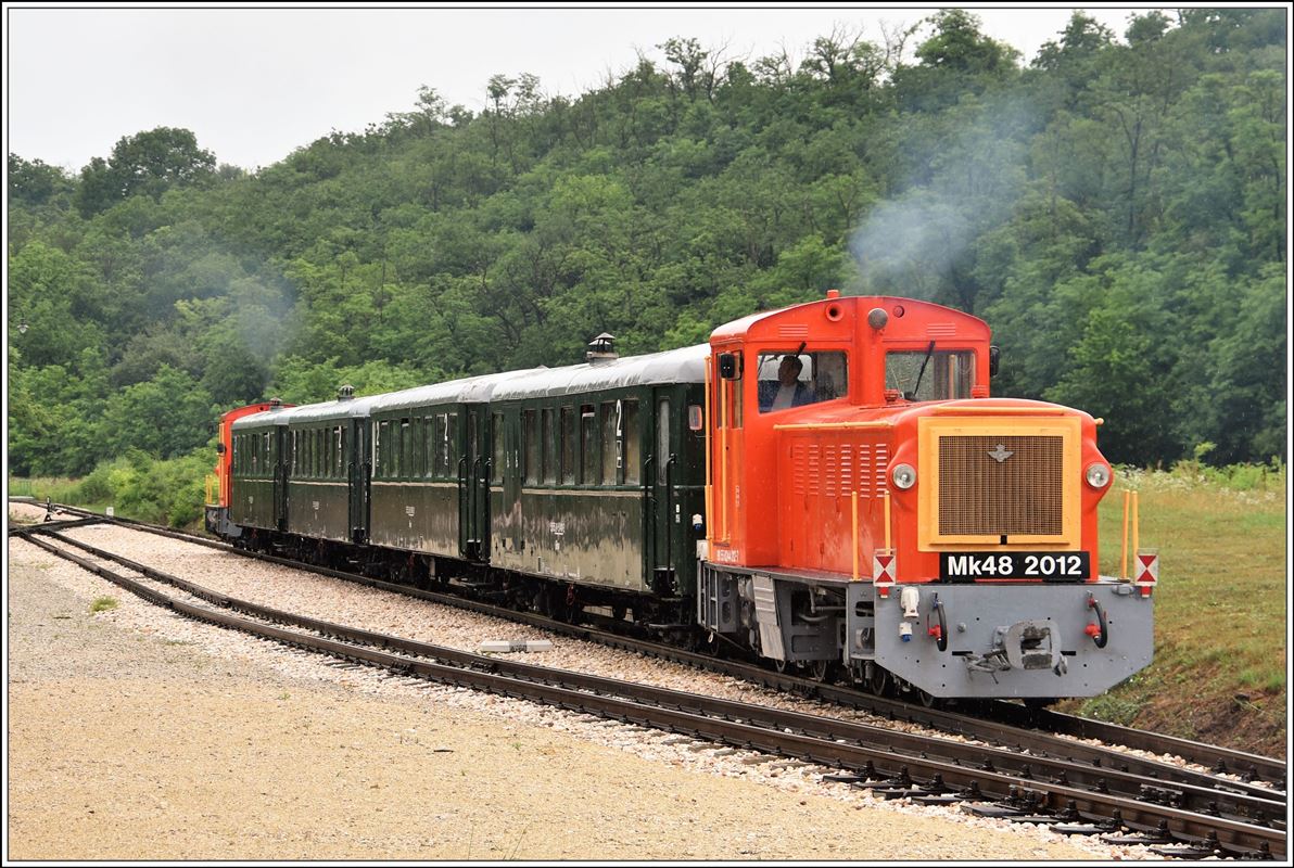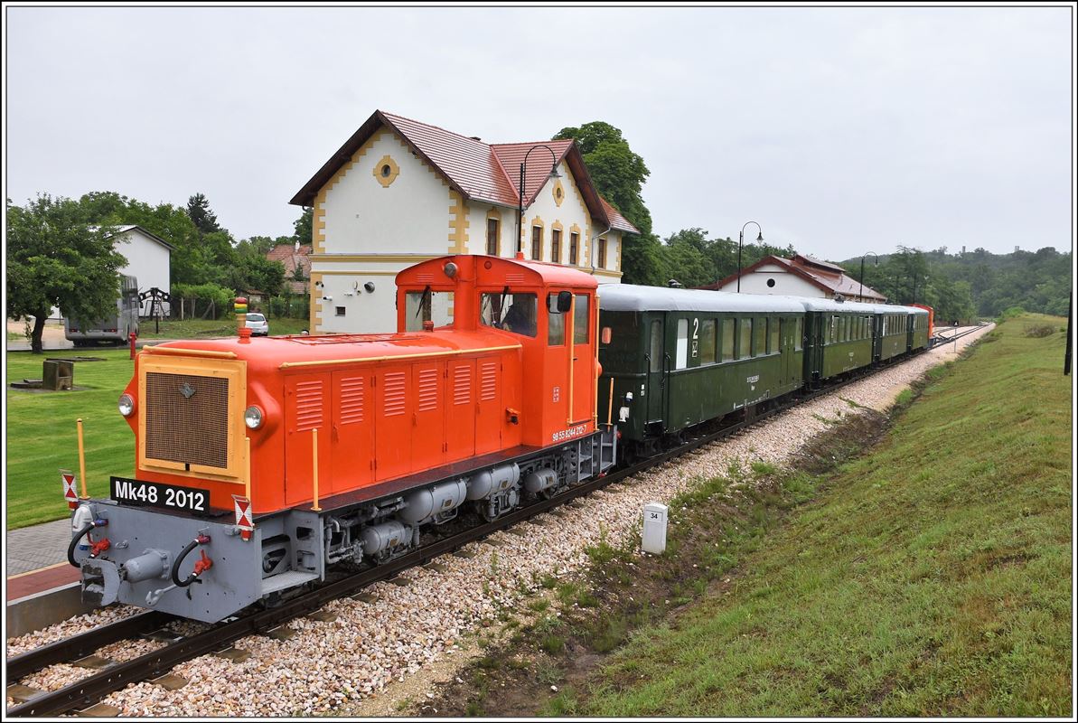 Vál-völgyi Kisvasút mit Mk48 2012 und 2016 im Sandwichbetrieb auf der 760mm Schmalspurbahn von Viktor Orban bei Felcsút. (09.06.2018)